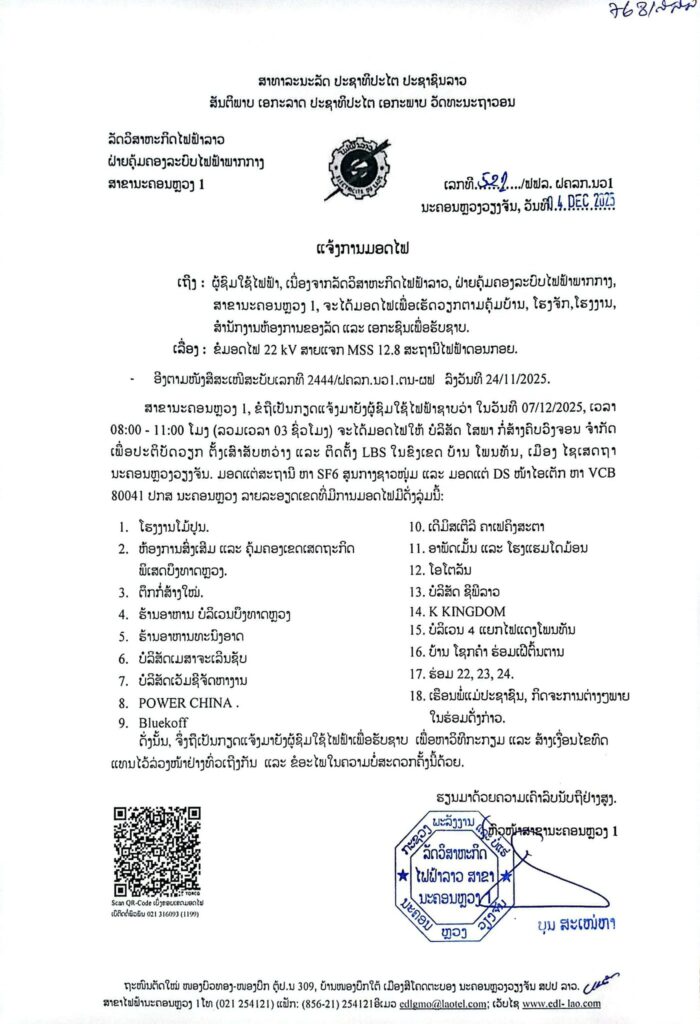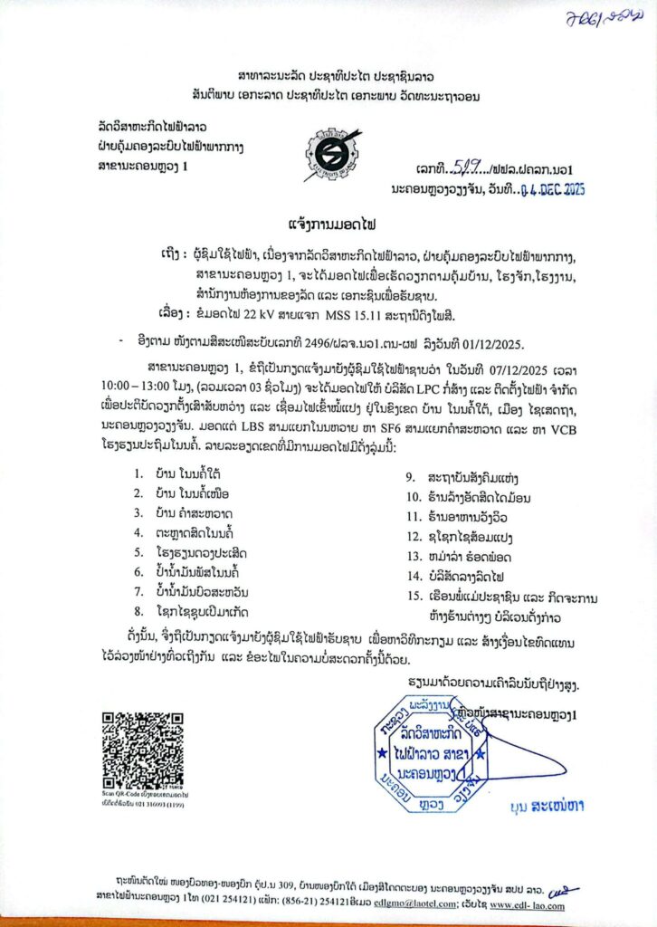 ແຈ້ງການ ແຈ້ງການມອດໄຟວັນທີ 6-7/12/2025 ເມືອງໄຊເສດຖາ By Pele ທີ 4 December, 2025 0 409 Share FacebookTwitterPinterestWhatsApp Must read ກຳປູເຈຍບຸກຈັບກຸມແກ໊ງຄໍເຊັນເຕີ ເປັນຄົນສັນຊາດໄທ 75 ຄົນ ທີ່ພົວພັນການສໍ້ໂກງຂ້າມຊາດທີ່ ພະນົມເປັນ ທີ 10 December, 2025 ເຊກອງ ສ້າງຄວາມເຂັ້ມແຂງໃຫ້ຫົວໜ່ວຍ ຈນກ ຜູ້ຜະລິດ ແລະ ປຸງແຕ່ງກາເຟ ທີ 10 December, 2025 ສພຂ ສະຫວັນນະເຂດ ລົງສຳຫລວດເສັ້ນທາງເລກ 10 ເພື່ອວາງແຜນສ້ອມແປງຄືນໃໝ່ ທີ 10 December, 2025 ລາຄານ້ຳມັນດິບຢູ່ໃນລະດັບຕ່ຳຫຼັງຈາກຫຼຸດລົງສອງວັນຕິດຕໍ່ກັນ ທ່າມກາງຄວາມກັງວົນກ່ຽວກັບສະພາບນ້ຳມັນລົ້ນຕະຫຼາດ ທີ 10 December, 2025 Pele ທີ່ມາ:EDL LAOS ລັດວິສາຫະກິດໄຟຟ້າລາວ ສາຂານະຄອນຫຼວງ1 Share FacebookTwitterPinterestWhatsApp Previous articleຄະນະຜູ້ແທນຂັ້ນສູງຂອງພັກກອມມູນິດກູບາ ເຂົ້າຢ້ຽມຂໍ່ານັບ ເລຂາທິການໃຫຍ່, ປະທານປະເທດແຫ່ງ ສປປ ລາວNext articleສຳເລັດພາລະກິດ ນັກບິນ ເຮືອບິນ Yak – 130 ກອງພັນໃຫຍ່ 702 ກັບຄືນສູ່ເດີນບິນທົ່ງໄຫຫີນແຂວງຊຽງຂວາງ - Advertisement - More articles ແຈ້ງການມອດໄຟ ວັນທີ 12,13/12/2025 ທີ 10 December, 2025 ເກີດແຜ່ນດິນໄຫວ ຂະໜາດ 3.5 ຣິກເຕີ ຢູ່ເມືອງນານ ແຂວງຫລວງພະບາງ ທີ 10 December, 2025 ສະມາຄົມນ້ຳດື່ມ ນະຄອນຫລວງວຽງຈັນ ແຈ້ງການປັບຂຶ້ນລາຄານ້ຳດື່ມຕຸກໃຫຍ່ 30% ເລີ່ມປະຕິບັດ 20 ທັນວາ 2025 ທີ 8 December, 2025 LEAVE A REPLY Cancel reply Comment: Please enter your comment! Name:* Please enter your name here Email:* You have entered an incorrect email address! Please enter your email address here Website: Save my name, email, and website in this browser for the next time I comment. - Advertisement - Latest article ກຳປູເຈຍບຸກຈັບກຸມແກ໊ງຄໍເຊັນເຕີ ເປັນຄົນສັນຊາດໄທ 75 ຄົນ ທີ່ພົວພັນການສໍ້ໂກງຂ້າມຊາດທີ່ ພະນົມເປັນ ທີ 10 December, 2025 ເຊກອງ ສ້າງຄວາມເຂັ້ມແຂງໃຫ້ຫົວໜ່ວຍ ຈນກ ຜູ້ຜະລິດ ແລະ ປຸງແຕ່ງກາເຟ ທີ 10 December, 2025 ສພຂ ສະຫວັນນະເຂດ ລົງສຳຫລວດເສັ້ນທາງເລກ 10 ເພື່ອວາງແຜນສ້ອມແປງຄືນໃໝ່ ທີ 10 December, 2025 ລາຄານ້ຳມັນດິບຢູ່ໃນລະດັບຕ່ຳຫຼັງຈາກຫຼຸດລົງສອງວັນຕິດຕໍ່ກັນ ທ່າມກາງຄວາມກັງວົນກ່ຽວກັບສະພາບນ້ຳມັນລົ້ນຕະຫຼາດ ທີ 10 December, 2025 ເກີດເຫດໄຟໄໝ້ອາຄານ 7 ຊັ້ນ ຢູ່ອິນໂດເນເຊຍ ເຮັດໃຫ້ມີ ຜູ້ເສຍຊີວິດ ຢ່າງໜ້ອຍ 20ຄົນ ທີ 10 December, 2025