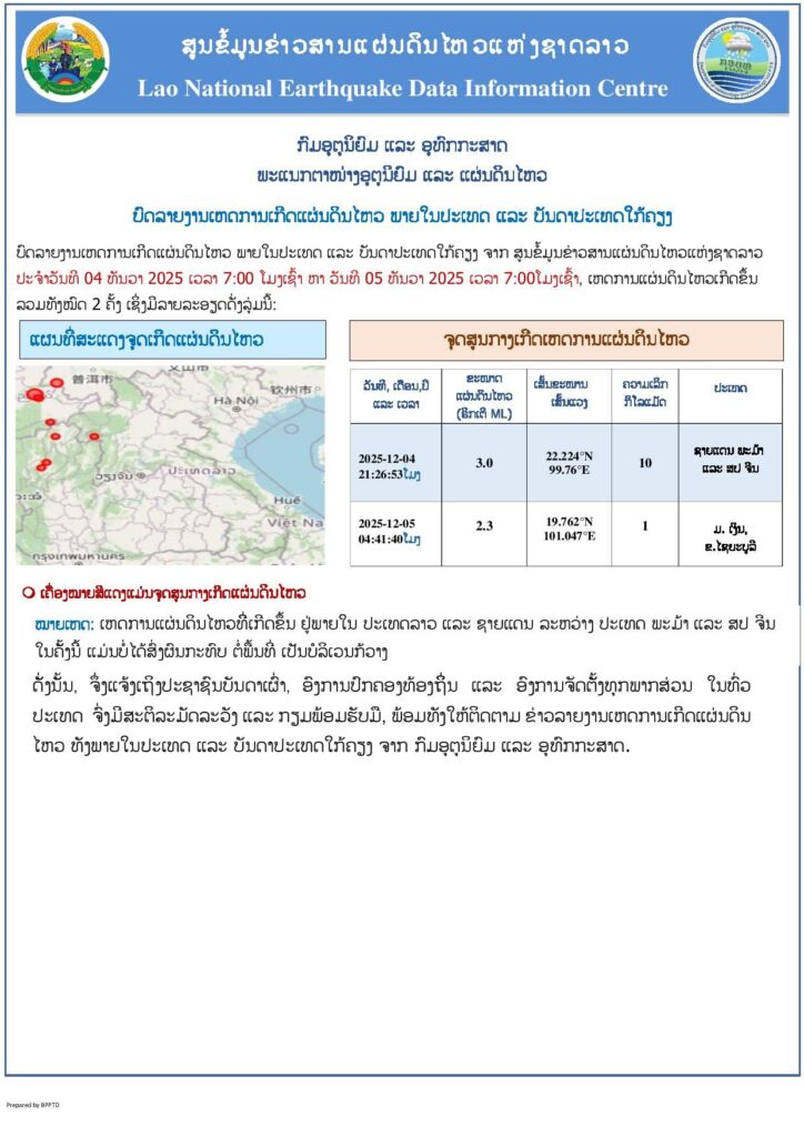 ສູນຂໍ້ມູນຂ່າວສານແຜ່ນດິນໄຫວແຫ່ງຊາດລາວ ລາຍງານເຫດການເກີດແຜ່ນດິນໄຫວ ພາຍໃນປະເທດ ແລະ ບັນດາປະເທດໃກ້ຄຽງ ປະຈຳວັນທີ 04 ທັນວາ 2025 ເວລາ 7 ໂມງເຊົ້າ ຫາ ວັນທີ 05 ທັນວາ 2025 ເວລາ 7 ໂມງເຊົ້າ, ເຫດການແຜ່ນດິນໄຫວເກີດຂຶ້ນ.