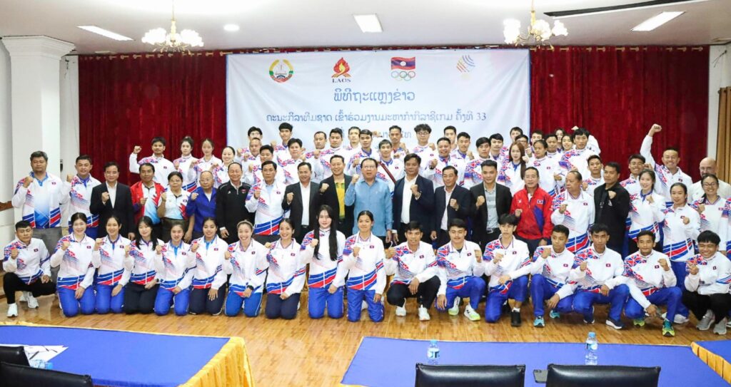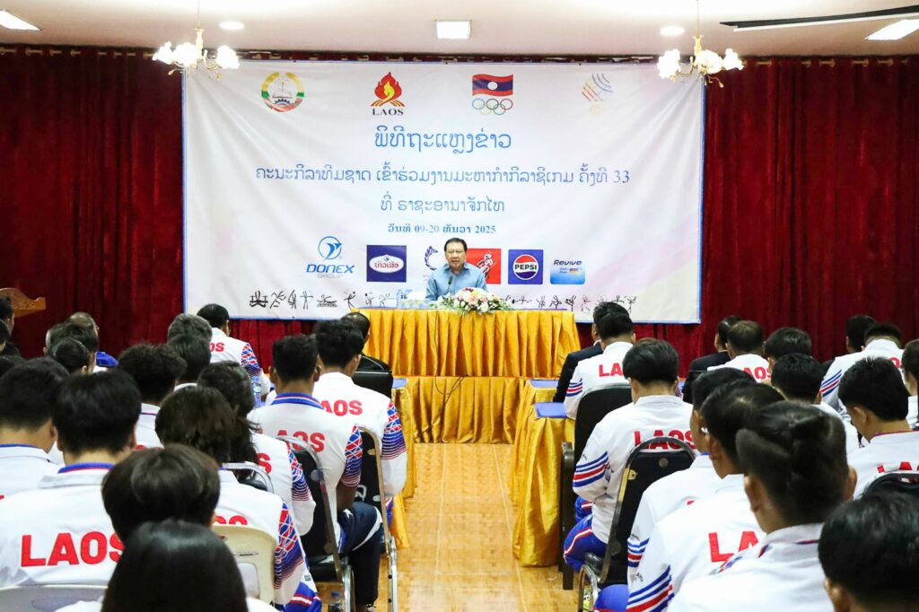 ພິທີຖະແຫຼງຂ່າວການກະກຽມຄວາມພ້ອມ ແລະ ໂອ້ລົມທັບນັກກິລາລາວ ກຽມເຂົ້າຮ່ວມງານມະຫະກຳກິລາຊີເກມ ຄັ້ງທີ 33 ທີ່ປະເທດໄທ ເປັນເຈົ້າພາບ ຈັດຂຶ້ນເມື່ອວັນທີ 5 ທັນວາ 2025 ທີ່ຫ້ອງປະຊຸມຄະນະກໍາການໂອແລມປີກແຫ່ງຊາດລາວ (ຄອລ) ໃຫ້ກຽດເຂົ້າຮ່ວມໂດຍ ທ່ານ ກິ່ງມະໂນ ພົມມະຫາໄຊ ຮອງລັດຖະມົນຕີກະຊວງສຶກສາທິການ ແລະ ກິລາ, ທັງເປັນຮອງປະທານ ຄອລ, ມີຮອງປະທານ ແລະ ເລຂາທິການ ຄອລ, ຄະນະນຳກົມກິລາລະດັບສູງ ພ້ອມດ້ວຍຄະນະ, ຄູຝຶກ-ນັກກິລາ ແລະ ຜູ້ໃຫ້ການສະໜັບສະໜູນ ເຂົ້າຮ່ວມ.