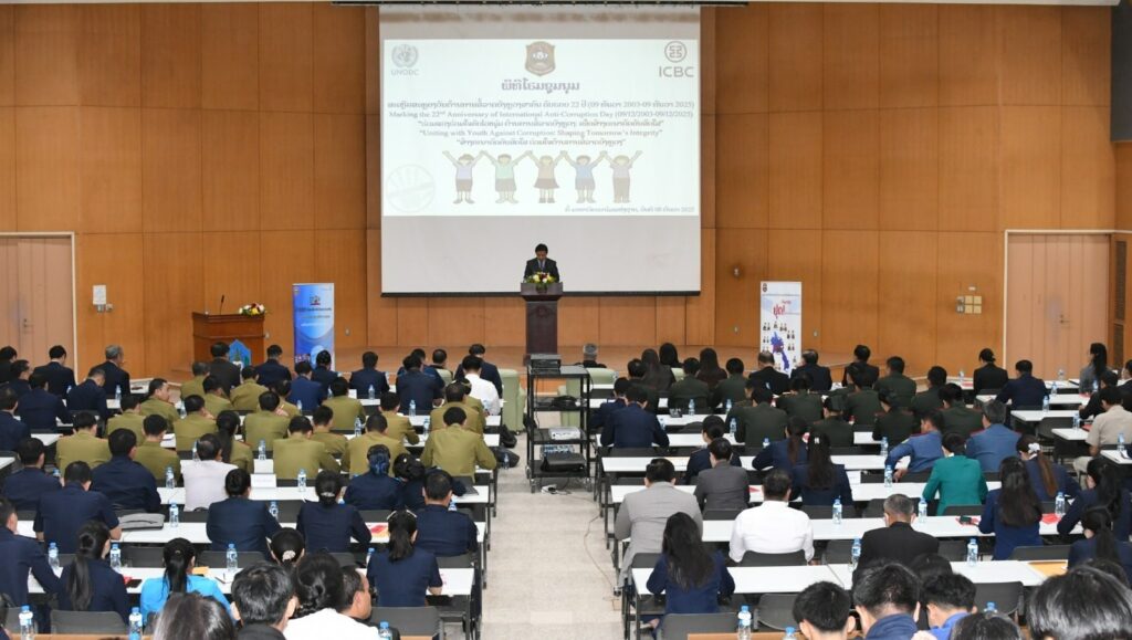ຂປລ. ອົງການກວດກາແຫ່ງລັດ ຮ່ວມກັບ ອົງການຕ້ານການສໍ້ລາດບັງຫລວງ ຂັ້ນສູນກາງ ໄດ້ຈັດພິທີສະເຫລີມສະຫລອງວັນຕ້ານການສໍ້ລາດບັງຫລວງສາກົນ ຄົບຮອບ 22 ປີ (9/12/2003-9/12/2025) ປະຈຳປີ 2025 ໃນວັນທີ 8 ທັນວາ 2025, ພາຍໃຕ້ຄໍາຂວັນ “ຮ່ວມແຮງ ຮ່ວມໃຈ ກັບໄວໜຸ່ມ ໃນການຕ້ານການສໍ້ລາດບັງຫລວງ ເພື່ອສ້າງອະນາຄົດອັນສົດໃສ” ໂດຍມີ ທ່ານ ວິໄລວັນ ບຸດດາຄຳ ຮອງປະທານອົງການກວດກາແຫ່ງລັດ, ຮອງຫົວໜ້າອົງການຕ້ານການສໍ້ລາດບັງຫລວງຂັ້ນສູນກາງ, ມີຜູ້ຕາງໜ້າຈາກອົງການສະຫະປະຊາຊາດ ເພື່ອຕ້ານຢາເສບຕິດ ແລະ ອາຊະຍາກຳ, ທະນາ ຄານອຸດສາຫະກຳ ແລະ ການຄ້າຈີນ ຈຳກັດ, ມີຜູ້ຕາງໜ້າທູຕານຸທູດ, ບັນດາກະຊວງ-ອົງການ, ລັດວິສາຫະກິດ ແລະ ຄູ-ອາຈານ, ນັກຮຽນ-ນັກສຶກສາ ເຂົ້າຮ່ວມ.