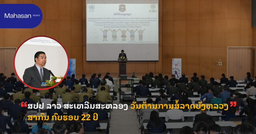 ຂປລ. ອົງການກວດກາແຫ່ງລັດ ຮ່ວມກັບ ອົງການຕ້ານການສໍ້ລາດບັງຫລວງ ຂັ້ນສູນກາງ ໄດ້ຈັດພິທີສະເຫລີມສະຫລອງວັນຕ້ານການສໍ້ລາດບັງຫລວງສາກົນ ຄົບຮອບ 22 ປີ (9/12/2003-9/12/2025) ປະຈຳປີ 2025 ໃນວັນທີ 8 ທັນວາ 2025, ພາຍໃຕ້ຄໍາຂວັນ “ຮ່ວມແຮງ ຮ່ວມໃຈ ກັບໄວໜຸ່ມ ໃນການຕ້ານການສໍ້ລາດບັງຫລວງ ເພື່ອສ້າງອະນາຄົດອັນສົດໃສ” ໂດຍມີ ທ່ານ ວິໄລວັນ ບຸດດາຄຳ ຮອງປະທານອົງການກວດກາແຫ່ງລັດ, ຮອງຫົວໜ້າອົງການຕ້ານການສໍ້ລາດບັງຫລວງຂັ້ນສູນກາງ, ມີຜູ້ຕາງໜ້າຈາກອົງການສະຫະປະຊາຊາດ ເພື່ອຕ້ານຢາເສບຕິດ ແລະ ອາຊະຍາກຳ, ທະນາ ຄານອຸດສາຫະກຳ ແລະ ການຄ້າຈີນ ຈຳກັດ, ມີຜູ້ຕາງໜ້າທູຕານຸທູດ, ບັນດາກະຊວງ-ອົງການ, ລັດວິສາຫະກິດ ແລະ ຄູ-ອາຈານ, ນັກຮຽນ-ນັກສຶກສາ ເຂົ້າຮ່ວມ.