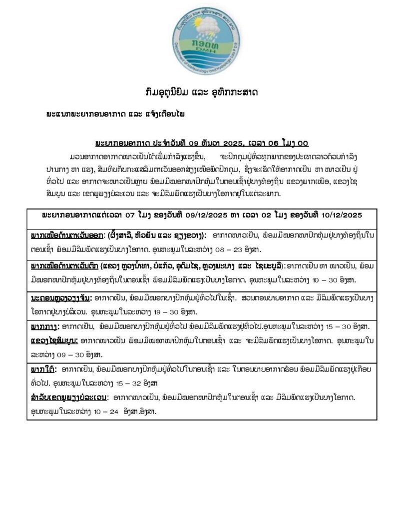 ມວນອາກາດໜາວເຢັນໄດ້ເພີ່ມກໍາລັງແຮງຂຶ້ນຈະປົກຄຸມຢູ່ທົ່ວທຸກພາກຂອງປະເທດລາວ ດ້ວຍກໍາລັງປານກາງ ຫາ ແຮງ, ສົມທົບກັບກະແສລົມຕາເວັນອອກສ່ຽງເໜືອພັດປົກຄຸມ, ເຊິ່ງຈະເຮັດໃຫ້ອາກາດເຢັນ ຫາ ໜາວເຢັນຢູ່ທົ່ວໄປ ແລະ ອາກາດຈະໜາວເຢັນຫລາຍ ພ້ອມມີໝອກໜາປົກຫຸ້ມໃນຕອນເຊົ້າຢູ່ບາງທ້ອງຖິ່ນ ແຂວງພາກເໜືອ, ແຂວງໄຊສົມບູນ ແລະ ເຂດພູພຽງບໍລະເວນ ແລະ ຈະມີລົມພັດແຮງເປັນບາງໂອກາດຢູ່ໃນແຕ່ລະພາກ.