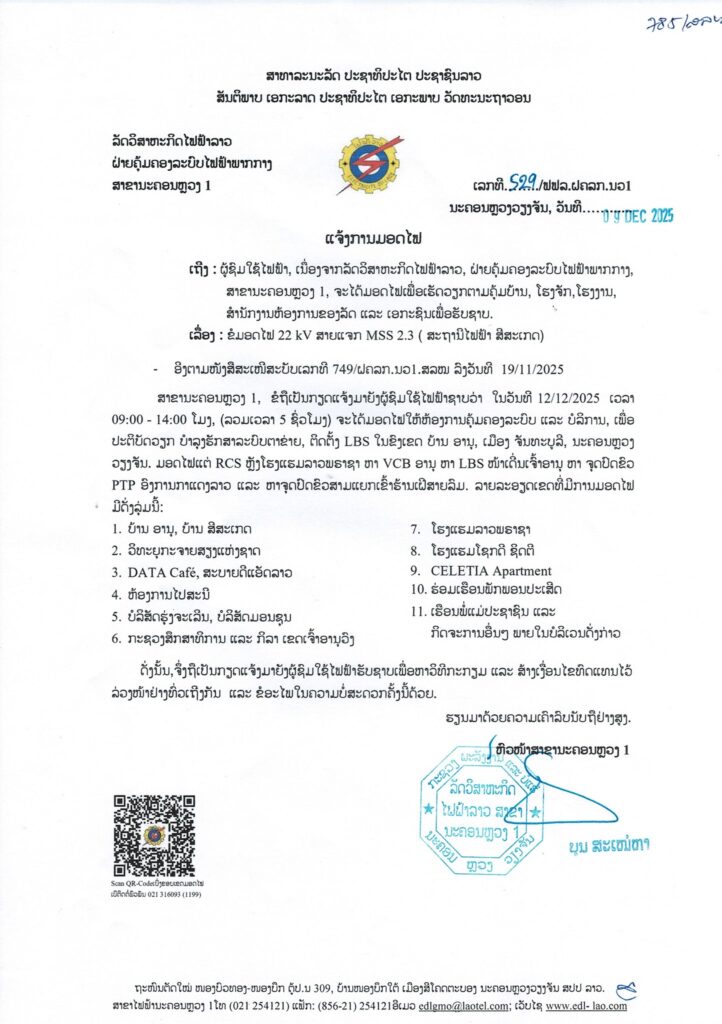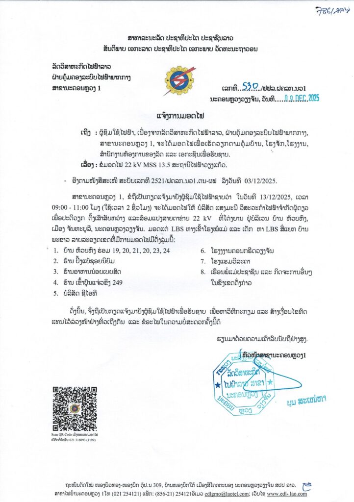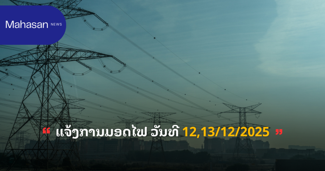 ແຈ້ງການ ແຈ້ງການມອດໄຟ ວັນທີ 12,13/12/2025 By Pele ທີ 10 December, 2025 0 824 Share FacebookTwitterPinterestWhatsApp Must read ແຈ້ງປັບລາຄານ້ຳມັນ ເລິ່ມປະຕິບັດ 06:00 ໂມງຂອງວັນທີ 11/12/2025 ທີ 11 December, 2025 ສປປ ລາວ-ສະຫະພາບເອີຣົບ ສະເຫຼີມສະຫຼອງສາຍພົວພັນຄົບຮອບ 50 ປີ ທີ 11 December, 2025 ຍິນດີນຳ ນ້ອງ ພຸດຕາວັນ ຈັນທະຄຳມະນີ ນັກກິລາເທຄວັນໂດ້ລາວ ໄດ້ 1 ຫລຽນທອງ ໃນຊີເກມ ຄັ້ງທີ 33 ທີ 11 December, 2025 ແຈ້ງການມອດໄຟວັນທີ 12/12/2025 ເມືອງສີສັດຕະນາກ ທີ 11 December, 2025 Pele ທີ່ມາ:EDL LAOS ລັດວິສາຫະກິດໄຟຟ້າລາວ ສາຂານະຄອນຫຼວງ1 Share FacebookTwitterPinterestWhatsApp Previous articleເກີດແຜ່ນດິນໄຫວ ຂະໜາດ 3.5 ຣິກເຕີ ຢູ່ເມືອງນານ ແຂວງຫລວງພະບາງNext articleຂະບວນພຣະສົງຍ່າງທຸດົງ ຢູ່ຜາດ່າງ-ຜາໄດ-ພູກອງເຂົ້າ ແຂວງວຽງຈັນ. - Advertisement - More articles ແຈ້ງປັບລາຄານ້ຳມັນ ເລິ່ມປະຕິບັດ 06:00 ໂມງຂອງວັນທີ 11/12/2025 ທີ 11 December, 2025 ແຈ້ງການມອດໄຟວັນທີ 12/12/2025 ເມືອງສີສັດຕະນາກ ທີ 11 December, 2025 ເກີດແຜ່ນດິນໄຫວ ຂະໜາດ 3.5 ຣິກເຕີ ຢູ່ເມືອງນານ ແຂວງຫລວງພະບາງ ທີ 10 December, 2025 LEAVE A REPLY Cancel reply Comment: Please enter your comment! Name:* Please enter your name here Email:* You have entered an incorrect email address! Please enter your email address here Website: Save my name, email, and website in this browser for the next time I comment. - Advertisement - Latest article ແຈ້ງປັບລາຄານ້ຳມັນ ເລິ່ມປະຕິບັດ 06:00 ໂມງຂອງວັນທີ 11/12/2025 ທີ 11 December, 2025 ສປປ ລາວ-ສະຫະພາບເອີຣົບ ສະເຫຼີມສະຫຼອງສາຍພົວພັນຄົບຮອບ 50 ປີ ທີ 11 December, 2025 ຍິນດີນຳ ນ້ອງ ພຸດຕາວັນ ຈັນທະຄຳມະນີ ນັກກິລາເທຄວັນໂດ້ລາວ ໄດ້ 1 ຫລຽນທອງ ໃນຊີເກມ ຄັ້ງທີ 33 ທີ 11 December, 2025 ແຈ້ງການມອດໄຟວັນທີ 12/12/2025 ເມືອງສີສັດຕະນາກ ທີ 11 December, 2025 ລາຍງານສະພາບອາກາດປະຈໍາວັນທີ 11 ທັນວາ ປີ 2025 ທີ 11 December, 2025