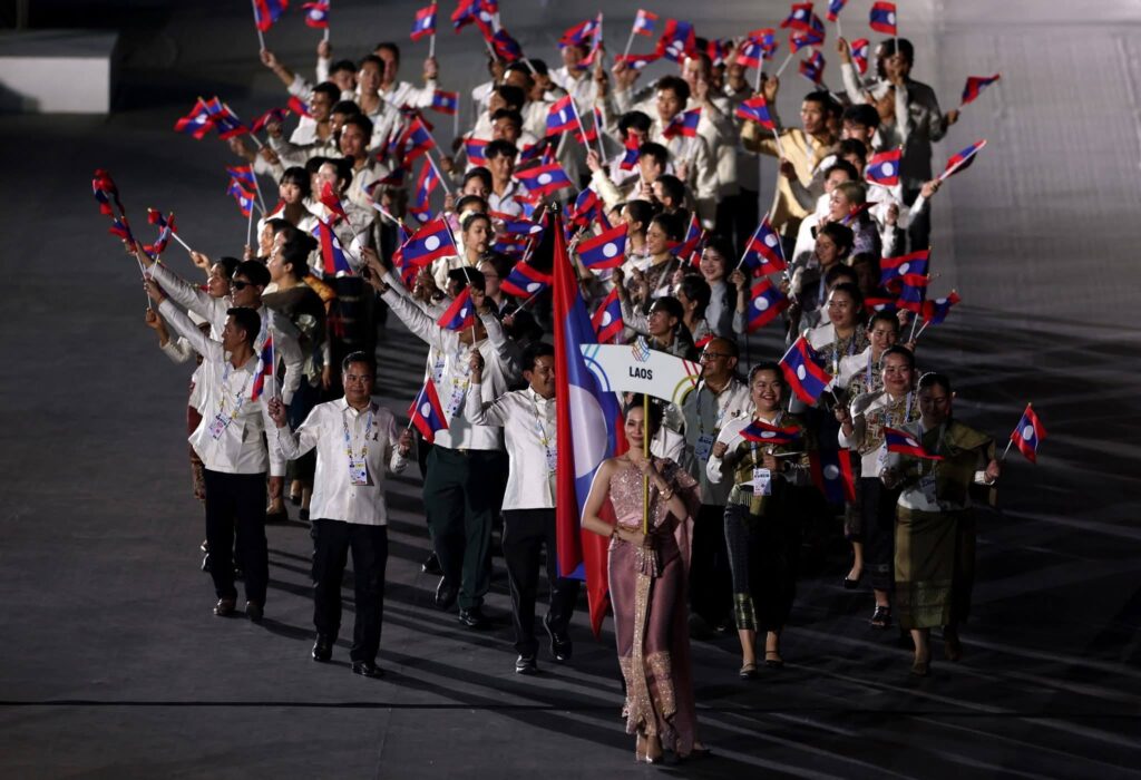 ຄະນະນັກກິລາລາວ ເປັນຂະບວນທີ 4 ໃນການເດີນສວນສະໜາມ ໂດຍມີ ວິລະສັກ ລາດຊະວົງ ນັກກິລາເປຕັງ ເຈົ້າຂອງຫຼຽນຄຳ ຊີເກມ ຄັ້ງທີ 32, ເປັນຜູ້ຖືທຸງ. ຄະນະນັກກິລາລາວ ນຳໂດຍ ທ່ານ ສີຈັນ ຈິດຕະປັນຍາ ຫົວໜ້າກົມກິລາລະດັບສູງ ກະຊວງສຶກສາທິການ ແລະ ກິລາ.