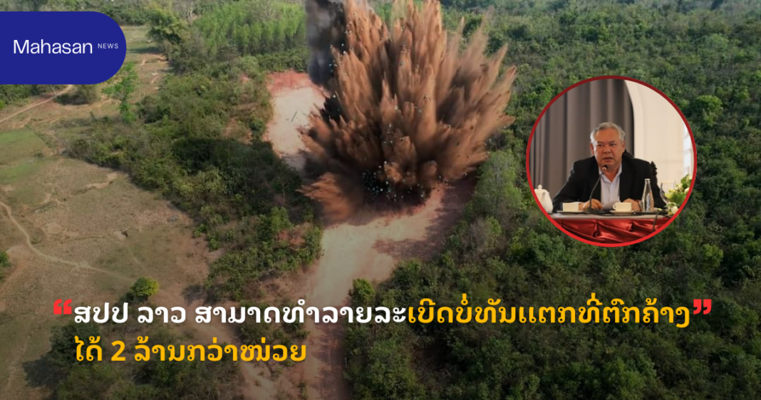 ທ່ານ ບຸນເພັງ ສີສະຫວັດ ຫົວໜ້າຫ້ອງການຄະນະກຳມະການຄຸ້ມຄອງເເຫ່ງຊາດ ເພື່ອເເກ້ໄຂບັນຫາລະເບີດບໍ່ທັນເເຕກ ທີ່ຕົກຄ້າງຢູ່ ສປປ ລາວ ໃຫ້ສຳພາດເມື່ອບໍ່ດົນນີ້ວ່າ: ນັບແຕ່ປີ 1996 ເປັນ ຕົ້ນມາ ການຈັດຕັ້ງປະຕິບັດວຽກງານແກ້ໄຂບັນຫາລະເບີດບໍ່ທັນເເຕກທີ່ຕົກຄ້າງ (ລບຕ) ແມ່ນຂຶ້ນກັບ ອົງການເກັບກູ້ລະເບີດແຫ່ງຊາດ ທີ່ເຮັດວຽກກັບບັນດາຄູ່ຮ່ວມງານ ທີ່ເປັນອົງການຈັດຕັ້ງສາກົນ. ນັບ ເເຕ່ມື້ເລີ່ມໂຄງການເກັບກູ້ລະເບີດຢູ່ລາວສາມາດ ທຳລາຍລະເບີດບໍ່ທັນເເຕກທີ່ຕົກຄ້າງ ໄດ້ທັງໝົດ 2.065.101 ໜ່ວຍ, ຄືນພື້ນທີດິນ ໃຫ້ຊຸມຊົນເພື່ອໃຊ້ປະໂຫຍດ ໄດ້ທັງໝົດ 99.580 ເຮັກຕາ.