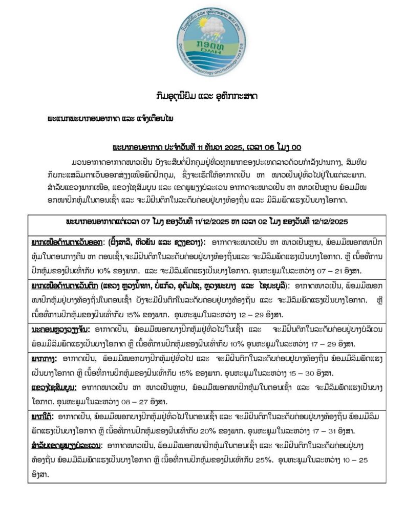 ສໍາລັບແຂວງພາກເໜືອ, ແຂວງໄຊສົມບູນ ແລະ ເຂດພູພຽງບໍລະເວນ ອາກາດຈະໜາວເຢັນ ຫາ ໜາວເຢັນຫລາຍ ພ້ອມມີໝອກໜາປົກຫຸ້ມໃນຕອນເຊົ້າ ແລະ ຈະມີຝົນຕົກໃນລະດັບຄ່ອຍຢູ່ບາງທ້ອງຖິ່ນ ແລະ ມີລົມພັດແຮງເປັນບາງໂອກາດ