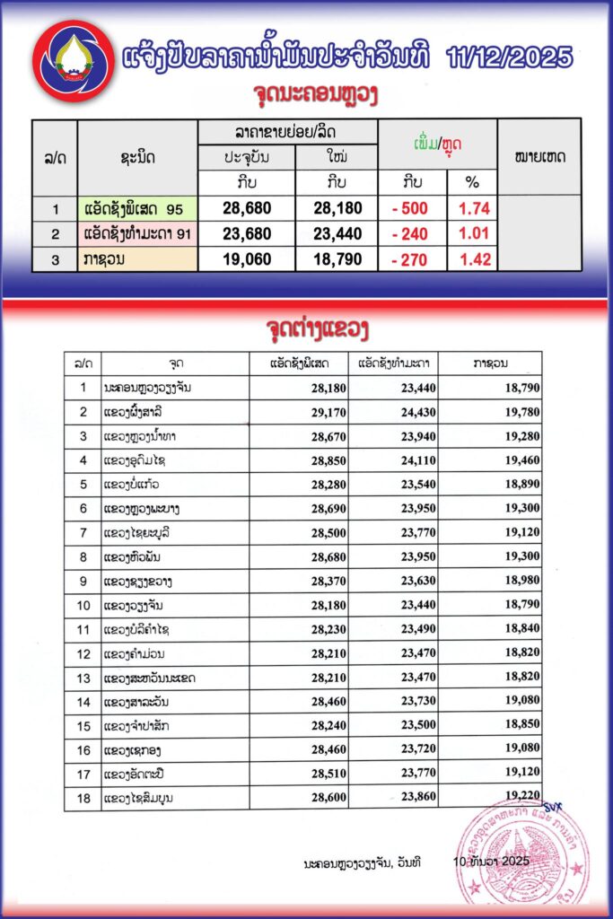 ແຈ້ງປັບລາຄານ້ຳມັນ ເລິ່ມປະຕິບັດ 06:00 ໂມງຂອງວັນທີ 11/12/2025 ຕາມແຈ້ງການຈາກ ກຊ ອຸດສະຫະກຳແລະການຄ້າ ເລກທີ 1884/ກຄພນ ລົງວັນທີ 10 ທວ. 2025