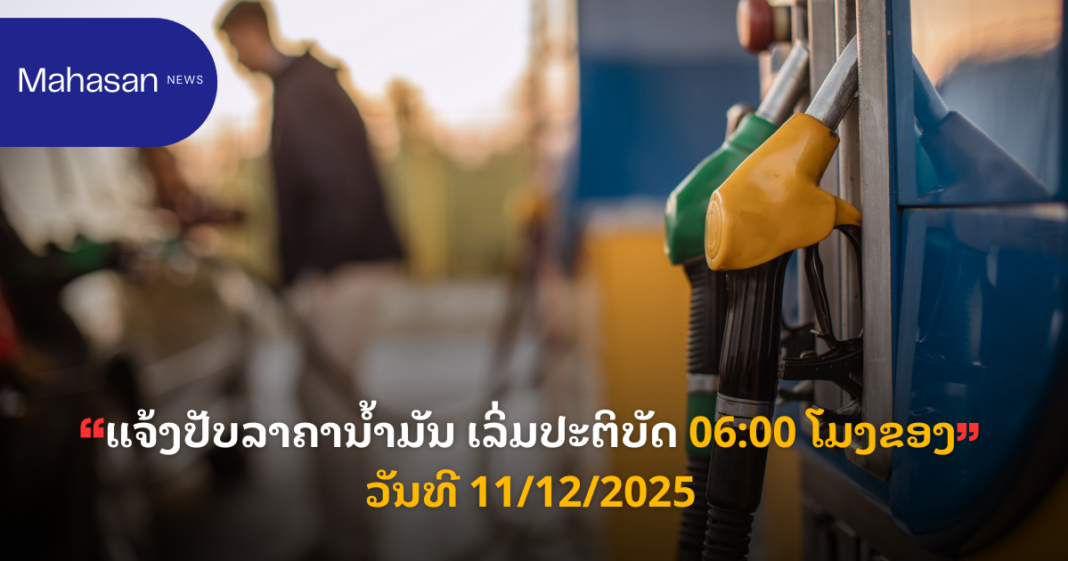 ແຈ້ງປັບລາຄານ້ຳມັນ ເລິ່ມປະຕິບັດ 06:00 ໂມງຂອງວັນທີ 11/12/2025 ຕາມແຈ້ງການຈາກ ກຊ ອຸດສະຫະກຳແລະການຄ້າ ເລກທີ 1884/ກຄພນ ລົງວັນທີ 10 ທວ. 2025