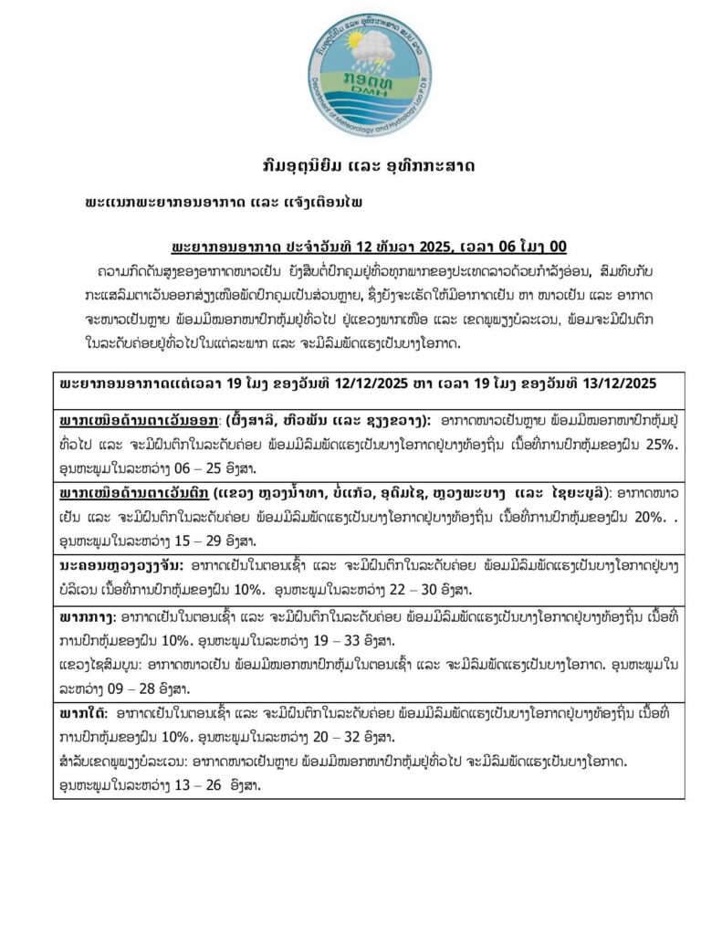 ຄວາມກົດດັນສູງຂອງອາກາດໜາວເຢັນ ຍັງສືບຕໍ່ປົກຄຸມຢູູ່ທົ່ວທຸກພາກຂອງປະເທດລາວ ດ້ວຍກຳລັງອ່ອນ, ສົມທົບກັບກະແສລົມຕາເວັນອອກສ່ຽງເໜືອພັດປົກຄຸມເປັນສ່ວນຫລາຍ, ເຊິ່ງຍັງຈະເຮັດໃຫ້ມີອາກາດເຢັນ ຫາ ໜາວເຢັນ ແລະ ອາກາດຈະໜາວເຢັນຫລາຍ ພ້ອມມີໝອກໜາປົກຫຸ້ມຢູູ່ທົ່ວໄປ ຢູູ່ແຂວງພາກເໜືອ ແລະ ເຂດພູພຽງບໍລະເວນ, ພ້ອມຈະມີຝົນຕົກໃນລະດັບຄ່ອຍຢູູ່ທົ່ວໄປໃນແຕ່ລະພາກ ແລະ ຈະມີລົມພັດແຮງເປັນບາງໂອກາດ.