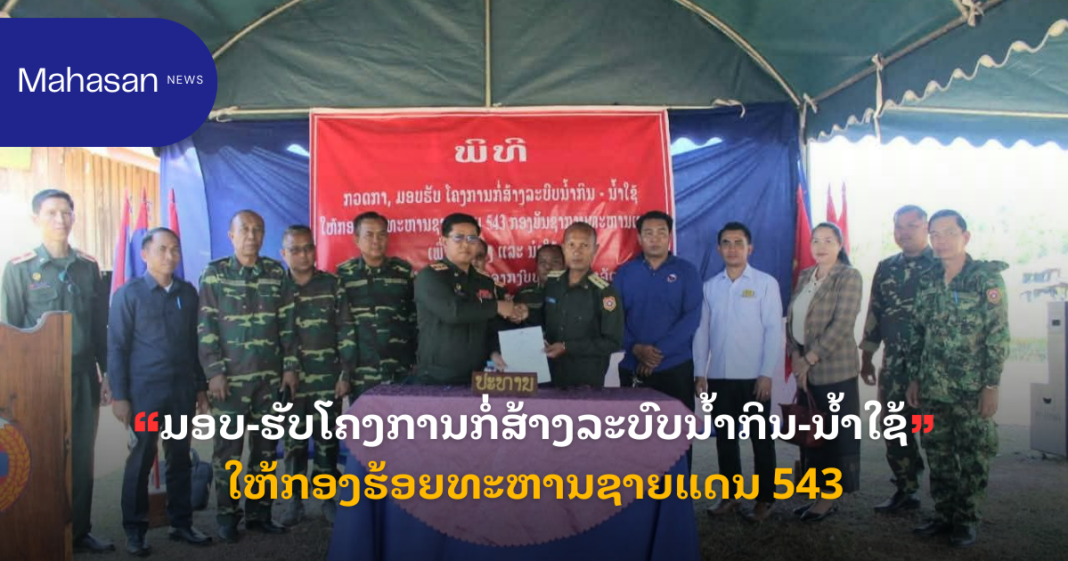 ແຫລ່ງຂ່າວຈາກ ແຂວງອັດຕະປື ໃຫ້ຮູ້ວ່າ: ພິທີມອບ-ຮັບ ໂຄງການກໍ່ສ້າງລະບົບນໍ້າກິນ-ນໍ້າໃຊ້ ໃຫ້ກອງຮ້ອຍທະຫານຊາຍແດນ 543 ທະການແຂວງອັດຕະປື ໄດ້ຈັດຂຶ້ນໃນອາທິດຜ່ານມາ ໂດຍມີທ່ານ ພັນເອກ ໄຊຍະພອນ ແກ້ວບົວພາສິດ ຫົວໜ້າຫ້ອງພະລາທິການທະຫານ ແຂວງອັດຕະປື, ມີຄະນະພັກ-ຄະນະບັນຊາ 5 ຫ້ອງ ກອງບັນຊາການທະຫານແຂວງ, ພະແນກການທີ່ກ່ຽວຂ້ອງຂອງແຂວງ ແລະ ພະນັກງານ-ນັກຮົບທົ່ວກອງຮ້ອຍທະຫານຊາຍແດນ 543 ເຂົ້າຮ່ວມ.
