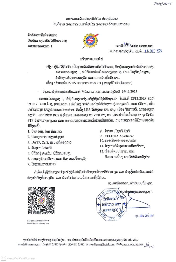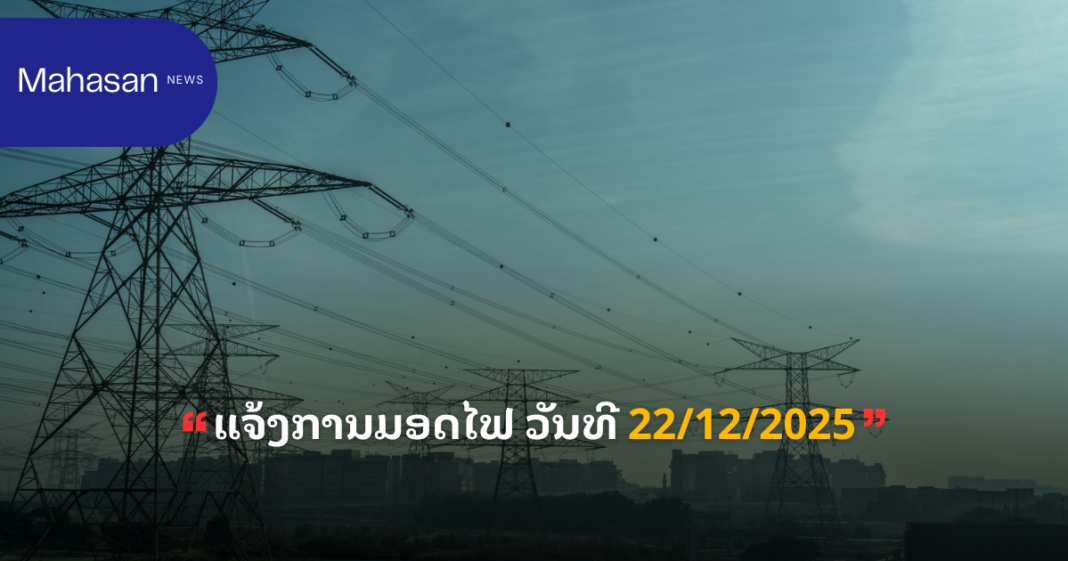 ແຈ້ງການ ແຈ້ງການມອດໄຟ ວັນທີ 22/12/2025 By Pele ທີ 17 December, 2025 0 161 Share FacebookTwitterPinterestWhatsApp Must read ລາຍງານສະພາບອາກາດປະຈໍາວັນທີ 17 ທັນວາ 2025 ທີ 17 December, 2025 ໂຄງການກໍ່ສ້າງຂົວມິດຕະພາບລາວ-ໄທແຫ່ງທີ 5 ຈະເປີດນຳໃຊ້ ໃນວັນທີ 25 ທັນວານີ້ ທີ 16 December, 2025 ລາວ-ຫວຽດນາມ ເພີ່ມທະວີຮັດແໜ້ນການຮ່ວມມືຮອບດ້ານ ທີ 16 December, 2025 ມອບ-ຮັບໂຄງການກໍ່ສ້າງລະບົບນ້ຳກິນ-ນໍ້າໃຊ້ໃຫ້ກອງຮ້ອຍທະຫານຊາຍແດນ 543 ທີ 16 December, 2025 Pele ທີ່ມາ:EDL LAOS ລັດວິສາຫະກິດໄຟຟ້າລາວ ສາຂານະຄອນຫຼວງ1 Share FacebookTwitterPinterestWhatsApp Previous articleລາຍງານສະພາບອາກາດປະຈໍາວັນທີ 17 ທັນວາ 2025 - Advertisement - More articles ແຈ້ງການມອດໄຟ ວັນທີ 16/12/2025 ເມືອງ ຈັນທະບູລີ ທີ 15 December, 2025 ແຈ້ງການມອດໄຟ ວັນທີ 13-14/12/2025 ທີ 12 December, 2025 ແຈ້ງປັບລາຄານ້ຳມັນ ເລິ່ມປະຕິບັດ 06:00 ໂມງຂອງວັນທີ 11/12/2025 ທີ 11 December, 2025 LEAVE A REPLY Cancel reply Comment: Please enter your comment! Name:* Please enter your name here Email:* You have entered an incorrect email address! Please enter your email address here Website: Save my name, email, and website in this browser for the next time I comment. - Advertisement - Latest article ລາຍງານສະພາບອາກາດປະຈໍາວັນທີ 17 ທັນວາ 2025 ທີ 17 December, 2025 ໂຄງການກໍ່ສ້າງຂົວມິດຕະພາບລາວ-ໄທແຫ່ງທີ 5 ຈະເປີດນຳໃຊ້ ໃນວັນທີ 25 ທັນວານີ້ ທີ 16 December, 2025 ລາວ-ຫວຽດນາມ ເພີ່ມທະວີຮັດແໜ້ນການຮ່ວມມືຮອບດ້ານ ທີ 16 December, 2025 ມອບ-ຮັບໂຄງການກໍ່ສ້າງລະບົບນ້ຳກິນ-ນໍ້າໃຊ້ໃຫ້ກອງຮ້ອຍທະຫານຊາຍແດນ 543 ທີ 16 December, 2025 ຄບຕ ຊີ້ແຈ້ງການຄຸ້ມຄອງຮອງລະບາຍນ້ຳ ໃນນະຄອນຫລວງວຽງຈັນ ທີ 16 December, 2025