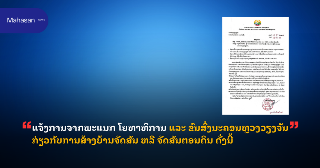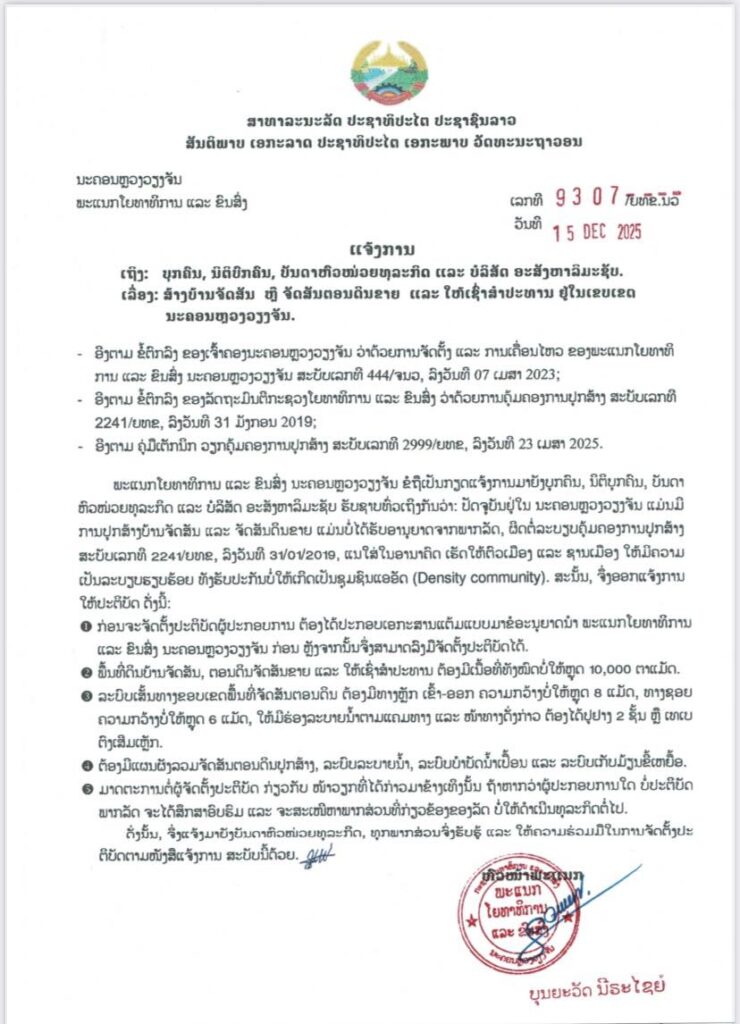 ພະແນກໂຍທາທິການ ແລະ ຂົນສົ່ງ ນະຄອນຫຼວງວຽງຈັນ ຂໍຖືເປັນກຽດແຈ້ງການມາຍັງບຸກຄົນ, ນິຕິບຸກຄົນ, ບັນດາ ຫົວຫນ່ວຍທຸລະກິດ ແລະ ບໍລິສັດ ອະສັງຫາລິມະຊັບ ຮັບຊາບທົ່ວເຖິງກັນວ່າ: ປັດຈຸບັນຢູ່ໃນ ນະຄອນຫຼວງວຽງຈັນ ແມ່ນມີ ການປຸກສ້າງບ້ານຈັດສັນ ແລະ ຈັດສັນດິນຂາຍ ແມ່ນບໍ່ໄດ້ຮັບອານຸຍາດຈາກພາກລັດ, ຜິດຕໍ່ລະບຽບຄຸ້ມຄອງການປຸກສ້າງ ສະບັບເລກທີ 2241/ຍທຂ, ລົງວັນທີ 31/01/2019, ແນໃສ່ໃນອານາຄົດ ເຮັດໃຫ້ຕົວເມືອງ ແລະ ຊານເມືອງ ໃຫ້ມີຄວາມ ເປັນລະບຽບຮຽບຮ້ອຍ ທັງຮັບປະກັນບໍ່ໃຫ້ເກີດເປັນຊຸມຊົນແອອັດ (Density community). ສະນັ້ນ, ຈຶ່ງອອກແຈ້ງການ ໃຫ້ປະຕິບັດ ດັ່ງນີ້: