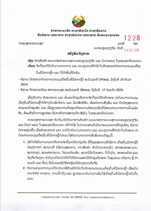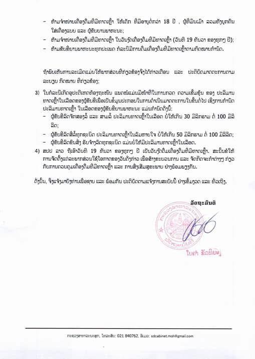 ກະຊວງສາທາລະນະສຸກ ອອກແຈ້ງການໃຫ້ຖືເອົາວັນທີ 19 ທັນວາ ຂອງທຸກໆປີເປັນວັນງົດເຄື່ອງດື່ມທີ່ມີທາດເຫຼົ້າ ຕາມແຈ້ງການດັ່ງນີ້: