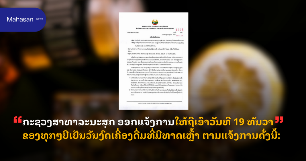 ກະຊວງສາທາລະນະສຸກ ອອກແຈ້ງການໃຫ້ຖືເອົາວັນທີ 19 ທັນວາ ຂອງທຸກໆປີເປັນວັນງົດເຄື່ອງດື່ມທີ່ມີທາດເຫຼົ້າ ຕາມແຈ້ງການດັ່ງນີ້: