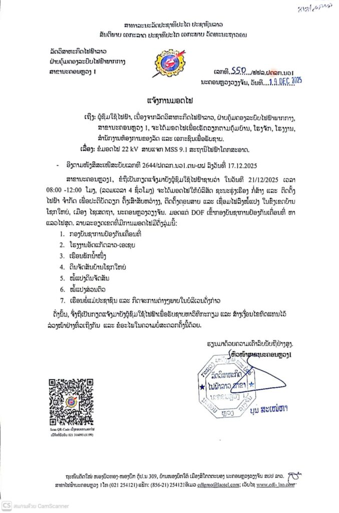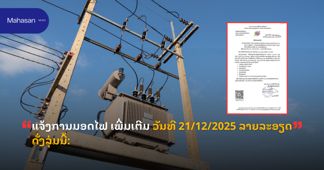 ແຈ້ງການ ແຈ້ງການມອດໄຟ ເພີ່ມເຕີມ ວັນທີ 21/12/2025 ລາຍລະອຽດດັ່ງລຸ່ມນີ້: By Jenjila ທີ 19 December, 2025 0 136 Share FacebookTwitterPinterestWhatsApp Must read ລັດຖະມົນຕີກະຊວງປ້ອງປະເທດ ເຄື່ອນໄຫວ ພາກສະໜາມກວດກູ້ ແລະ ທຳລາຍລະເບີດບໍ່ທັນແຕກ ເພື່ອທະນຸດສະທຳ ລາວ-ຣັດເຊຍ ທີ 19 December, 2025 ແຈ້ງການມອດໄຟ ວັນທີ 20 ແລະ 21 ທັນວາ 2025 ດັ່ງລຸ່ມນີ້: ທີ 19 December, 2025 ສາຫາລືດ້ານການເມືອງ ຂັ້ນລັດຖະມົນຕີ ລະຫວ່າງສອງກະຊວງການຕ່າງປະເທດ ລາວ-ຫວຽດນາມ ທີ 19 December, 2025 ກະຊວງສາທາລະນະສຸກ ອອກແຈ້ງການໃຫ້ຖືເອົາວັນທີ 19 ທັນວາ ຂອງທຸກໆປີເປັນວັນງົດເຄື່ອງດື່ມທີ່ມີທາດເຫຼົ້າ ຕາມແຈ້ງການດັ່ງນີ້: ທີ 19 December, 2025 Jenjila ແຈ້ງການມອດໄຟ ວັນທີ 21/12/2025 ລາຍລະອຽດດັ່ງລຸ່ມນີ້: Share FacebookTwitterPinterestWhatsApp Previous articleລັດຖະມົນຕີກະຊວງປ້ອງປະເທດ ເຄື່ອນໄຫວ ພາກສະໜາມກວດກູ້ ແລະ ທຳລາຍລະເບີດບໍ່ທັນແຕກ ເພື່ອທະນຸດສະທຳ ລາວ-ຣັດເຊຍ - Advertisement - More articles ແຈ້ງການມອດໄຟ ວັນທີ 20 ແລະ 21 ທັນວາ 2025 ດັ່ງລຸ່ມນີ້: ທີ 19 December, 2025 ກະຊວງສາທາລະນະສຸກ ອອກແຈ້ງການໃຫ້ຖືເອົາວັນທີ 19 ທັນວາ ຂອງທຸກໆປີເປັນວັນງົດເຄື່ອງດື່ມທີ່ມີທາດເຫຼົ້າ ຕາມແຈ້ງການດັ່ງນີ້: ທີ 19 December, 2025 ແຈ້ງການຈາກພະແນກ ໂຍທາທິການ ແລະ ຂົນສົ່ງນະຄອນຫຼວງວຽງຈັນ ກ່ຽວກັບການສ້າງບ້ານຈັດສັນ ຫລື ຈັດສັນຕອນດິນ ດັ່ງນີ້ ທີ 18 December, 2025 LEAVE A REPLY Cancel reply Comment: Please enter your comment! Name:* Please enter your name here Email:* You have entered an incorrect email address! Please enter your email address here Website: Save my name, email, and website in this browser for the next time I comment. - Advertisement - Latest article ລັດຖະມົນຕີກະຊວງປ້ອງປະເທດ ເຄື່ອນໄຫວ ພາກສະໜາມກວດກູ້ ແລະ ທຳລາຍລະເບີດບໍ່ທັນແຕກ ເພື່ອທະນຸດສະທຳ ລາວ-ຣັດເຊຍ ທີ 19 December, 2025 ແຈ້ງການມອດໄຟ ວັນທີ 20 ແລະ 21 ທັນວາ 2025 ດັ່ງລຸ່ມນີ້: ທີ 19 December, 2025 ສາຫາລືດ້ານການເມືອງ ຂັ້ນລັດຖະມົນຕີ ລະຫວ່າງສອງກະຊວງການຕ່າງປະເທດ ລາວ-ຫວຽດນາມ ທີ 19 December, 2025 ກະຊວງສາທາລະນະສຸກ ອອກແຈ້ງການໃຫ້ຖືເອົາວັນທີ 19 ທັນວາ ຂອງທຸກໆປີເປັນວັນງົດເຄື່ອງດື່ມທີ່ມີທາດເຫຼົ້າ ຕາມແຈ້ງການດັ່ງນີ້: ທີ 19 December, 2025 BRT ສຶກສາເປີດຈຸດຈອດລົດ 10 ແຫ່ງ ຕາມເສັ້ນທາງ ແຕ່ສວນເຈົ້າຟ້າງຸ່ມ-ມະຫາວິທະຍາໄລແຫ່ງຊາດ ກຽມພ້ອມຫຼັງເປີດເກັບຄ່າບໍລິການ ທີ 19 December, 2025