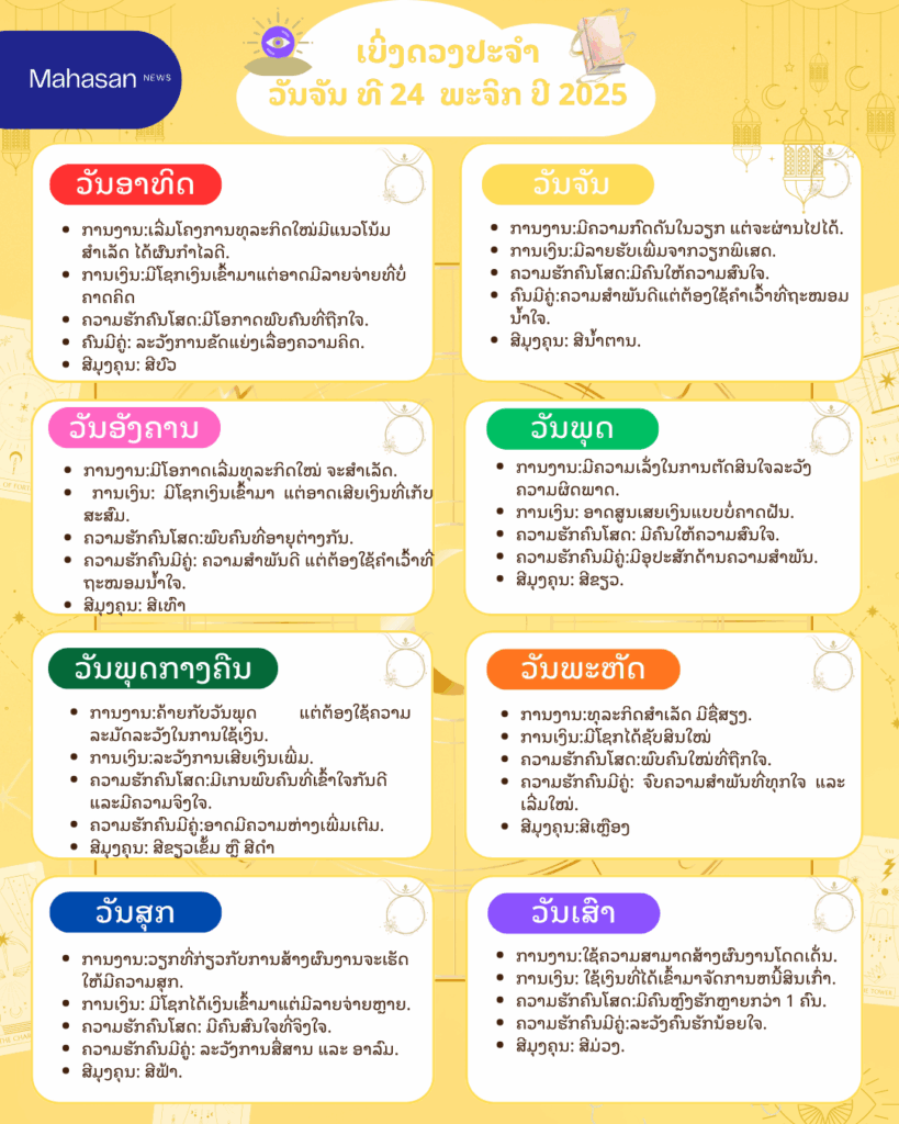 ເບິ່ງດວງ ເບິ່ງດວງປະຈຳວັນຈັນ ທີ 24 ພະຈິກ ປີ 2025 By Jenjila ທີ 24 November, 2025 0 16 Share FacebookTwitterPinterestWhatsApp Must read ພິທີ ມອບ-ຮັບໂຮງຮຽນມັດທະຍົມຕອນຕົ້ນ ບ້ານຮ່ອງຄູ ທີ 28 November, 2025 ເປີດງານວາງສະແດງຮູບພາບຜົນງານການເຄື່ອນໄຫວຂອງ ປະທານ ໄກສອນ ພົມວິຫານ ທີ 28 November, 2025 ສະພາບອາກາດປະຈໍາວັນທີ 28 ພະຈິກ ປີ 2025 ທີ 28 November, 2025 ສປສສ ປະດັບຫຼຽນກາລະນຶກ 50 ປີ ທີ 28 November, 2025 Jenjila Share FacebookTwitterPinterestWhatsApp Previous articleສະພາບອາກາດປະຈໍາວັນທີ 24 ພະຈິກ ປີ 2025Next articleຂ່າວຕ່າງປະເທດເຈົ້າໜ້າທີ່ມຽນມາ ທຳລາຍໂທລະສັບ ແລະ ຄອມພີວເຕີ ຂອງແກ້ງຄໍເຊັນເຕີຖີ້ມ ລວມ 22 ພັນກວ່າໜ່ວຍ. - Advertisement - More articles ເບິ່ງດວງປະຈຳວັນອັງຄານ ທີ 25 ພະຈິກ ປີ 2025 ທີ 25 November, 2025 LEAVE A REPLY Cancel reply Comment: Please enter your comment! Name:* Please enter your name here Email:* You have entered an incorrect email address! Please enter your email address here Website: Save my name, email, and website in this browser for the next time I comment. - Advertisement - Latest article ພິທີ ມອບ-ຮັບໂຮງຮຽນມັດທະຍົມຕອນຕົ້ນ ບ້ານຮ່ອງຄູ ທີ 28 November, 2025 ເປີດງານວາງສະແດງຮູບພາບຜົນງານການເຄື່ອນໄຫວຂອງ ປະທານ ໄກສອນ ພົມວິຫານ ທີ 28 November, 2025 ສະພາບອາກາດປະຈໍາວັນທີ 28 ພະຈິກ ປີ 2025 ທີ 28 November, 2025 ສປສສ ປະດັບຫຼຽນກາລະນຶກ 50 ປີ ທີ 28 November, 2025 ເອກອ້າງທະນົງໃຈຕໍ່ໄຊຊະນະ ແລະ ຜົນງານ 50 ປີ ສປປ ລາວ ທີ 28 November, 2025