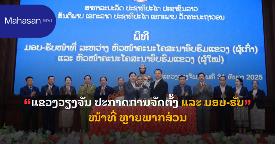 ໃນວັນທີ 31 ທັນວາ 2025 ນີ້, ຢູ່ທີ່ສະໂມສອນຂອງແຂວງວຽງຈັນ ໄດ້ຈັດພິທີ ປະກາດການຈັດຕັ້ງ ແລະ ມອບ-ຮັບໜ້າທີ່ ຫົວໜ້າຫ້ອງວ່າການແຂວງ, ພະແນການ, ອົງການຈັດຕັ້ງພັກ-ລັດ, ອົງການຈັດຕັ້ງມະຫາຊົນ ພາຍໃນແຂວງ ໂດຍການເປັນກຽດເຂົ້າຮ່ວມຂອງ ທ່ານ ພູທະນູເພັດ ໄຊສົມບັດ ເລຂາຄະນະບໍລິຫານງານພັກແຂວງ, ທ່ານ ພູວົງ ບຸນຊູ ຮອງເລຂາຄະນະບໍລິຫານງານພັກແຂວງ ປະທານຄະນະກຳມະການປົກຄອງແຂວງ, ທ່ານ ບຸນສອນ ເພັດລາວັນ ປະທານສະພາປະຊາຊົນແຂວງ.