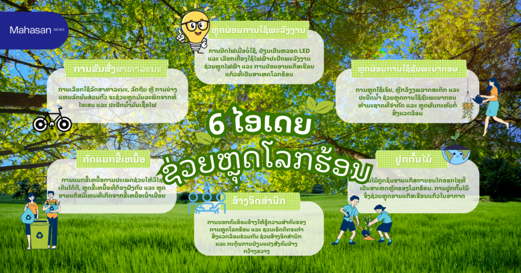 ໂລກຮ້ອນເປັນບັນຫາສຳຄັນທີ່ທຸກຄົນຕ້ອງຮ່ວມມືກັນແກ້ໄຂ. ນີ້ແມ່ນ 6 ແນວທາງງ່າຍໆ ທີ່ພວກເຮົາສາມາດເຮັດໄດ້ເພື່ອຊ່ວຍຫຼຸດໂລກຮ້ອນ: