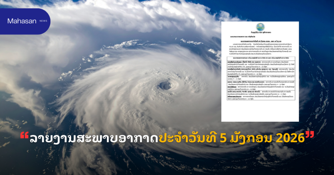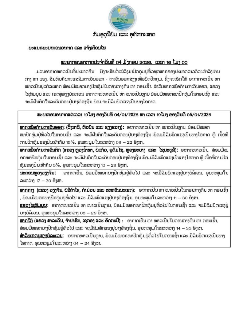 ພະຍາກອນອາກາດ ແຕ່ເວລາ 07 ໂມງ ຂອງວັນທີ 05/01/2026 ຫາ ເວລາ 07 ໂມງຂອງວັນທີ 06/01/2026