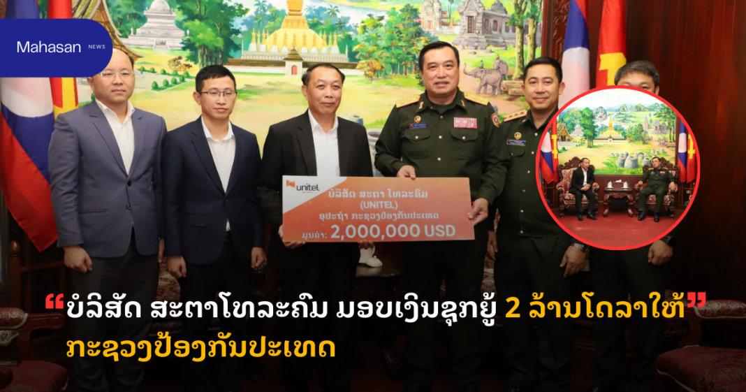 ວັນທີ 2 ມັງກອນຜ່ານມາ, ທີ່ກະຊວງປ້ອງກັນປະເທດ ສະຫາຍ ພົນຈັດຕະວາ ສຸບັນ ພັນທະວີ ຮອງຜູ້ອໍານວຍການໃຫຍ່ ບໍລິສັດ ສະຕາໂທລະຄົມ ພ້ອມຄະນະໄດ້ມອບເງິນຊຸກຍູ້ຈໍານວນ 2 ລ້ານໂດລາໃຫ້ກະຊວງປ້ອງກັນປະເທດ.
