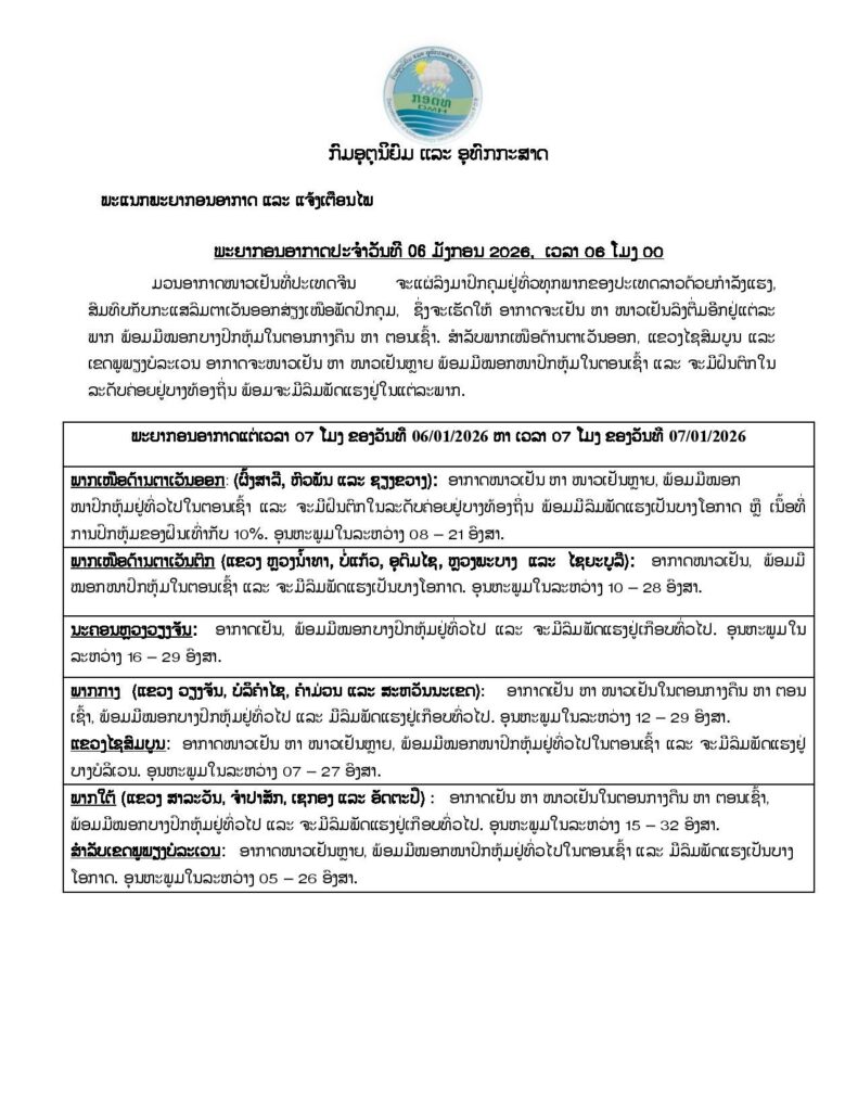 ມວນອາກາດໜາວເຢັນທີ່ປະເທດຈີນ ຈະແຜ່ລົງມາປົກຄຸມຢູ່ທົ່ວທຸກພາກຂອງປະເທດລາວ ດ້ວຍກໍາລັງແຮງ, ສົມທົບກັບກະແສລົມຕາເວັນອອກສ່ຽງເໜືອພັດປົກຄຸມ, ເຊິ່ງຈະເຮັດໃຫ້ອາກາດຈະເຢັນ ຫາ ໜາວເຢັນລົງຕື່ມອີກຢູ່ແຕ່ລະພາກ ພ້ອມມີໝອກບາງປົກຫຸ້ມໃນຕອນກາງຄືນ ຫາ ຕອນເຊົ້າ. ສໍາລັບພາກເໜືອດ້ານຕາເວັນອອກ, ແຂວງໄຊສົມບູນ ແລະເຂດພູພຽງບໍລະເວນ ອາກາດຈະໜາວເຢັນ ຫາ ໜາວເຢັນຫລາຍ ພ້ອມມີໝອກໜາປົກຫຸ້ມໃນຕອນເຊົ້າ ແລະ ຈະມີຝົນຕົກໃນລະດັບຄ່ອຍຢູ່ບາງທ້ອງຖິ່ນ ພ້ອມຈະມີລົມພັດແຮງຢູ່ໃນແຕ່ລະພາກ.