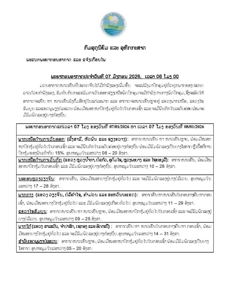 ມວນອາກາດໜາວເຢັນທີ່ປະເທດຈີນ ໄດ້ມີກໍາລັງແຮງເພີ່ມຂຶ້ນນຈະແຜ່ລົງມາປົກຄຸມຢູ່ທົົ່ວທຸກພາກຂອງປະເທດລາວ ດ້ວຍກໍາລັງແຮງ, ສົມທົບກັບກະແສລົມຕາເວັນອອກສ່ຽງເໜືອພັດປົກຄຸມຈະມີກໍາລັງປານກາງພັດປົກຄຸມ, ເຊິ່ງຈະເຮັດໃຫ້ອາກາດຈະເຢັນ ຫາ ໜາວເຢັນລົງຕື່ມອີກຢູ່ໃນແຕ່ລະພາກ ແລະ ອາກາດຈະໜາວເຢັນຫລາຍຢູ່ແຂວງພາກເໜືອ, ແຂວງໄຊສົມບູນ ແລະເຂດພູພຽງບໍລະເວນ ພ້ອມມີໝອກໜາປົກຫຸ້ມຢູ່ທົົ່ວໄປໃນຕອນເຊົ້າ ແລະ ຈະມີຝົນຕົກໃນລະດັບຄ່ອຍ ພ້ອມຈະມີລົມພັດແຮງຢູ່ບາງທ້ອງຖິ່ນ.