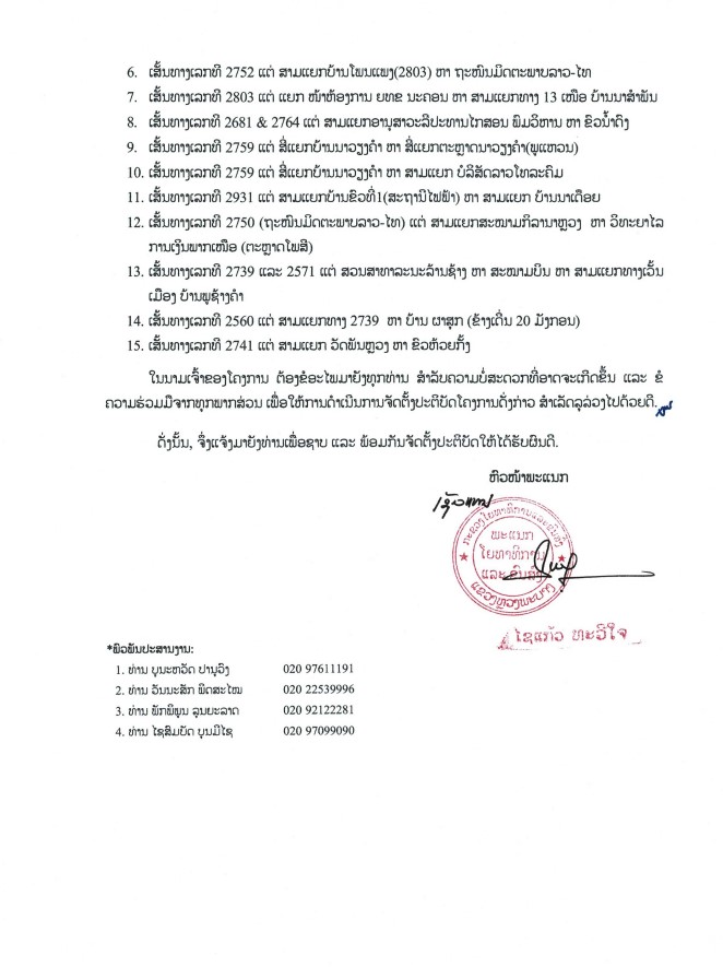 ສະນັ້ນ, ເພື່ອໃຫ້ການເດີນທາງ, ການຈະລາຈອນເປັນລະບຽບຮຽບຮ້ອຍ ແລະ ປອດໄພ ຈຶ່ງຂໍແຈ້ງໃຫ້ພາກສ່ວນທີ່ກ່ຽວຂ້ອງ ແລະ ຜູ້ນໍາໃຊ້ເສັ້ນທາງທຸກທ່ານ ກະລຸນາວາງແຜນເສັ້ນທາງ ແລະ ເວລາໃນການ ເດີນທາງລ່ວງໜ້າ, ຫຼີກລ້ຽງເສັ້ນທາງທີ່ກຳລັງດຳເນີນການສ້ອມແປງ, ປະຕິບັດຕາມປ້າຍສັນຍານຈະລາຈອນ ແລະ ຄໍາແນະນໍາຂອງເຈົ້າໜ້າທີ່ຢ່າງເຂັ້ມງວດ.