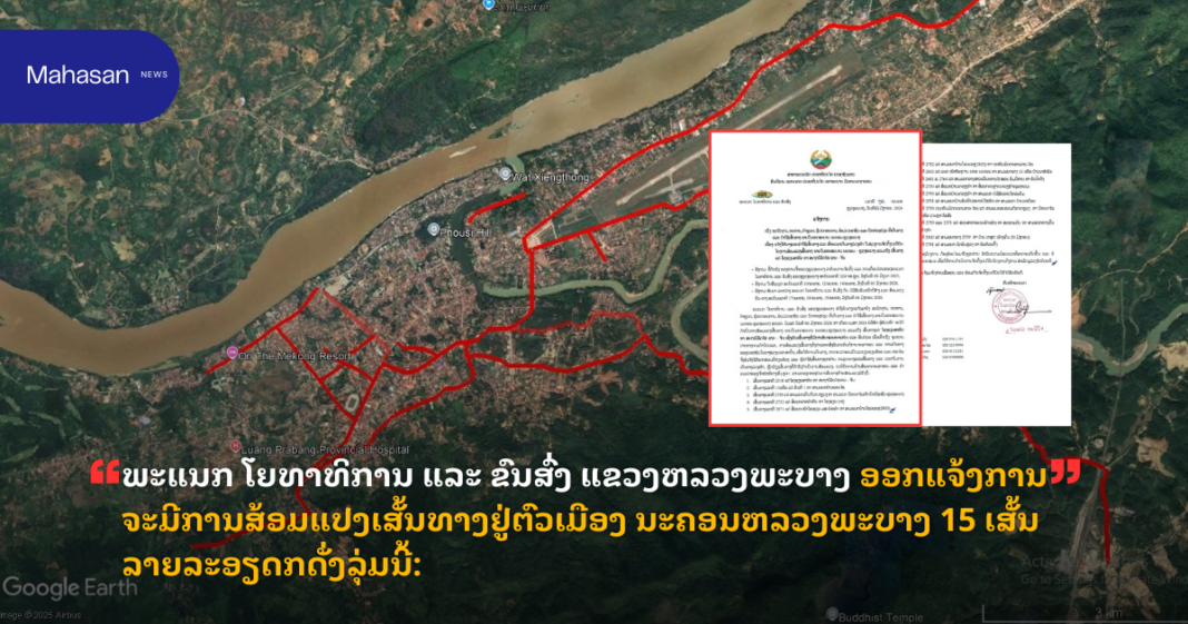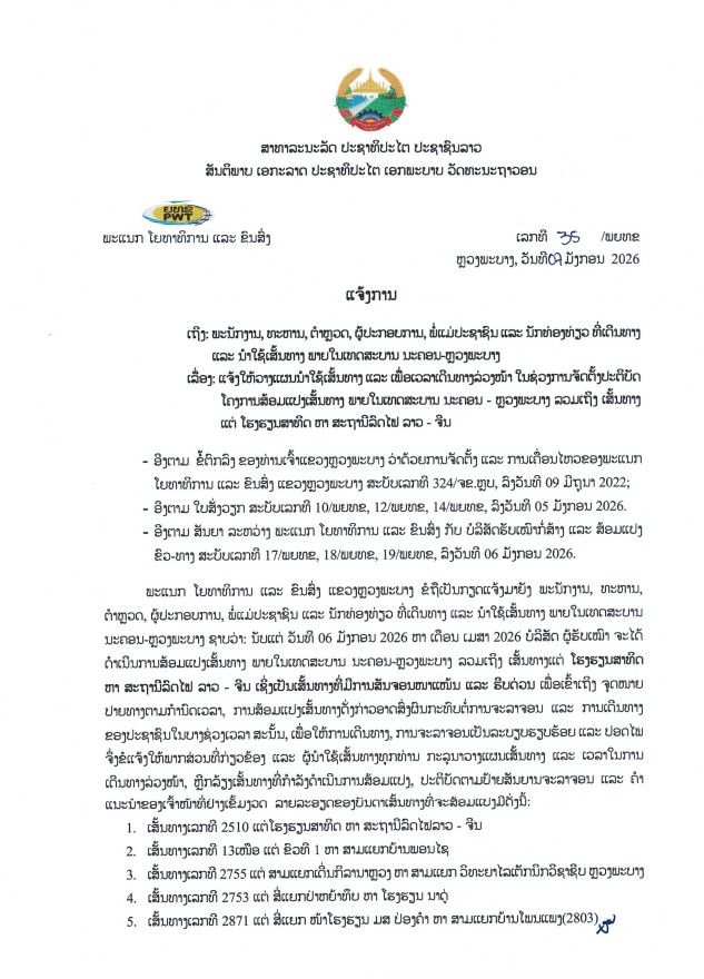 ວັນທີ 7 ມັງກອນ 2025 ພະແນກ ໂຍທາທິການ ແລະ ຂົນສົ່ງ ແຂວງຫລວງພະບາງ ອອກແຈ້ງການວາງແຜນນໍາໃຊ້ເສັ້ນທາງ ແລະ ເພື່ອເວລາເດີນທາງລ່ວງໜ້າ ໃນຊ່ວງການຈັດຕັ້ງປະຕິບັດ ໂຄງການສ້ອມແປງເສັ້ນທາງ ພາຍໃນເທດສະບານ ນະຄອນ – ຫລວງພະບາງ ລວມເຖິງ ເສັ້ນທາງ ແຕ່ ໂຮງຮຽນສາທິດ ຫາ ສະຖານີລົດໄຟ ລາວ – ຈີນ ວ່າ: ນັບແຕ່ ວັນທີ 6 ມັງກອນ 2026 ຫາ ເດືອນ ເມສາ 2026 ບໍລິສັດ ຜູ້ຮັບເໝົາ ຈະໄດ້ ດໍາເນີນການສ້ອມແປງເສັ້ນທາງ ພາຍໃນເທດສະບານ ນະຄອນ-ຫລວງພະບາງ ລວມເຖິງ ເສັ້ນທາງແຕ່ ໂຮງຮຽນສາທິດ ຫາ ສະຖານີລົດໄຟ ລາວ – ຈີນ ເຊິ່ງເປັນເສັ້ນທາງທີ່ມີການສັນຈອນໜາແໜ້ນ ແລະ ຮີບດ່ວນ ເພື່ອເຂົ້າເຖິງ ຈຸດໝາຍ ປາຍທາງຕາມກຳນົດເວລາ, ການສ້ອມແປງເສັ້ນທາງດັ່ງກ່າວອາດສົ່ງຜົນກະທົບຕໍ່ການຈະລາຈອນ ແລະ ການເດີນທາງ ຂອງປະຊາຊົນໃນບາງຊ່ວງເວລາ.