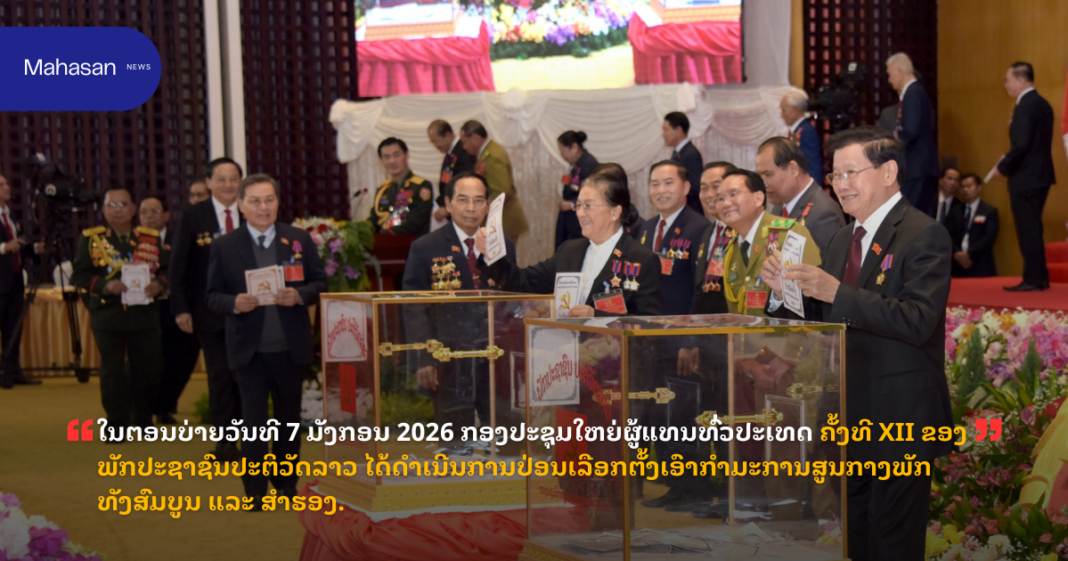 ຜູ້ແທນກອງປະຊຸມໃຫຍ່ເລືອກຕັ້ງເອົາຄະນະບໍລິຫານງານສູນກາງພັກສະໄຫມທີ XIIຂປລ. ໃນຕອນບ່າຍວັນທີ 7 ມັງກອນ 2026 ກອງປະຊຸມໃຫຍ່ຜູ້ແທນທົ່ວປະເທດ ຄັ້ງທີ XII ຂອງພັກປະຊາຊົນ ປະຕິວັດລາວ ໄດ້ດໍາເນີນການປ່ອນບັດເລືອກຕັ້ງ ເອົາຄະນະບໍລິຫານງານສູນກາງພັກ ສະໄໝທີ XII ຂອງພັກ ເພື່ອແບກຫາບພາລະໜ້າທີ່ອັນໜັກໜ່ວງ ທີ່ພັກກໍຄືປະຊາຊົນໄດ້ມອບໝາຍໃຫ້.