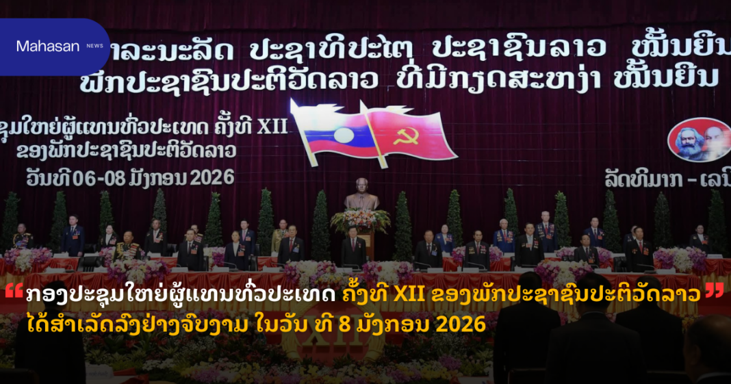 ກອງປະຊຸມໃຫຍ່ຜູ້ແທນທົ່ວປະເທດ ຄັ້ງທີ XII ຂອງພັກປະຊາຊົນປະຕິວັດລາວ ໄດ້ສໍາເລັດລົງຢ່າງຈົບງາມ ໃນວັນ ທີ 8 ມັງກອນ 2026 ພາຍຫຼັງດຳເນີນກອງປະຊຸມມາເປັນເວລາ 3 ວັນ ພາຍໃຕ້ຄຳຂວັນ “ຍົກສູງບົດບາດການນໍາພາທີ່ເຂັ້ມແຂງຂອງພັກ, ຕັ້ງໜ້າສ້າງເສດຖະກິດ ເອກະລາດ ເປັນເຈົ້າຕົນເອງ, ສືບຕໍ່ບູລະນະລະບອບປະຊາທິປະໄຕປະຊາຊົນ ໃຫ້ໜັກແໜ້ນ ກ້າວຂຶ້ນສູ່ສັງຄົມນິຍົມ” .