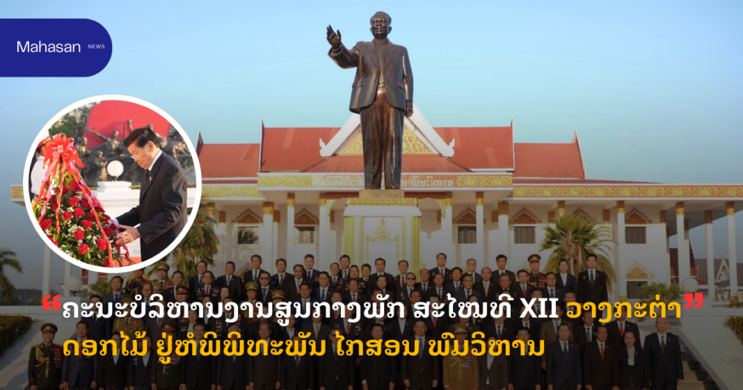 ຂປລ. ຕອນເຊົ້າວັນທີ 9 ມັງກອນ 2026 ນີ້, ຄະນະບໍລິຫານງານສູນກາງພັກ ປະຊາຊົນປະຕິວັດລາວ ສະໄໝທີ XII ນຳໂດຍ ສະຫາຍ ທອງລຸນ ສີສຸລິດ ເລຂາທິການໃຫຍ່ ຄະນະບໍລິຫານງານສູນກາງພັກປະຊາຊົນປະຕິວັດລາວ ພ້ອມດ້ວຍຄະນະ ໄດ້ເຂົ້າວາງກະຕ່າດອກໄມ້ ຢູ່ຫໍພິພິທະພັນ ໄກສອນ ພົມວິຫານ ເນື່ອງໃນໂອກາດຊົມເຊີຍຜົນສຳເລັດກອງປະຊຸມໃຫຍ່ຜູ້ແທນທົ່ວປະເທດ ຄັ້ງທີ XII ຂອງພັກປະຊາຊົນປະຕິວັດລາວ.