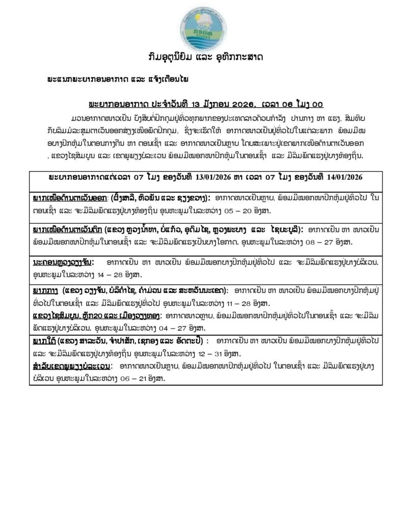 ນະຄອນຫລວງວຽງຈັນ: ອາກາດເຢັນ ຫາ ໜາວເຢັນ ພ້ອມມີໝອກບາງປົກຫຸ້ມຢູ່ທົ່ວໄປ ແລະ ຈະມີລົມພັດແຮງຢູ່ບາງບໍລິເວນ ອຸນຫະພູມໃນລະຫວ່າງ 14–28 ອົງສາ.