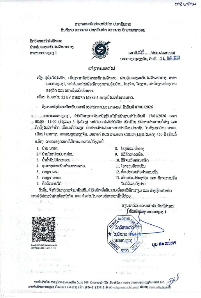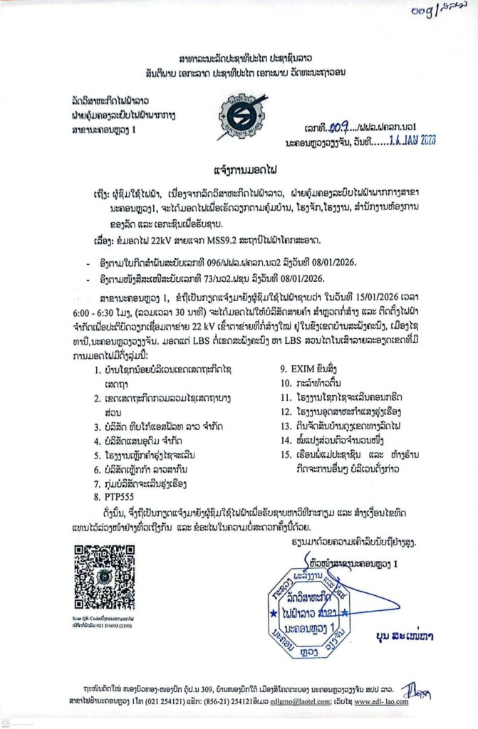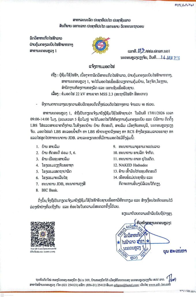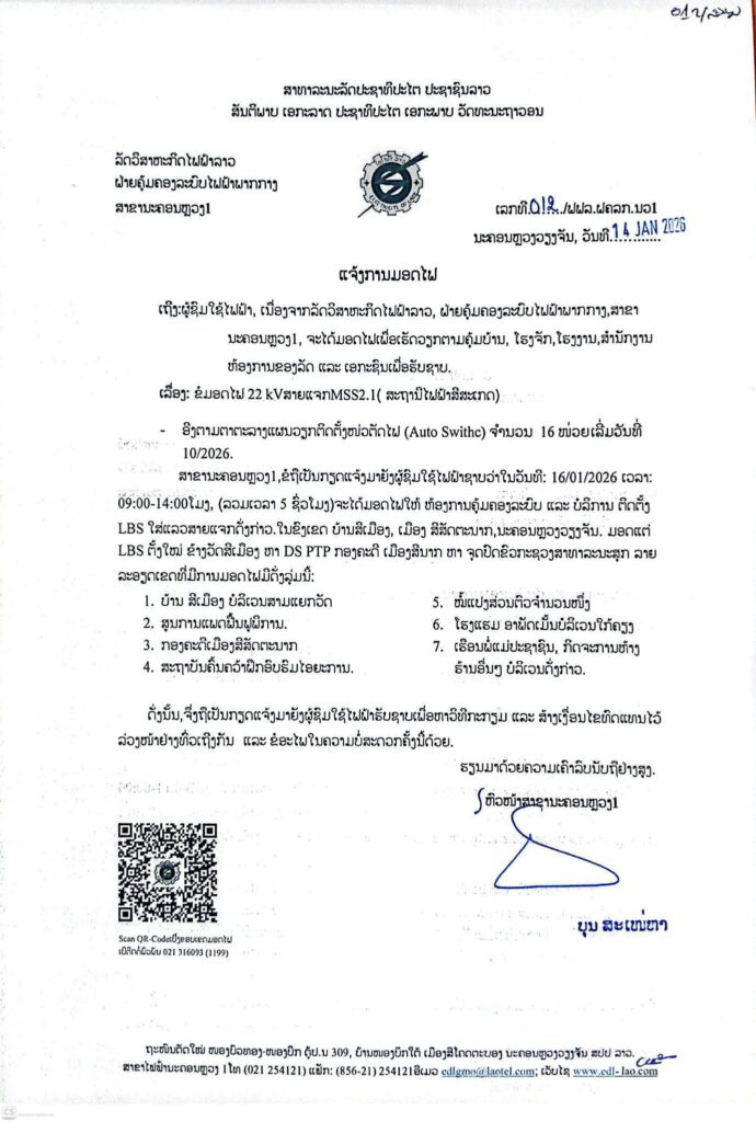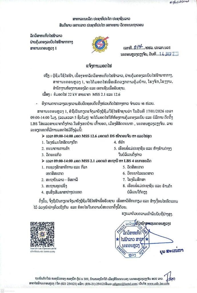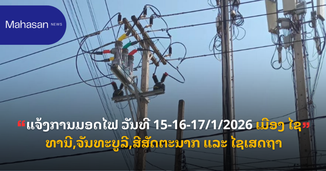 ແຈ້ງການ ແຈ້ງການມອດໄຟ ວັນທີ 15-16-17/1/2026 ເມືອງ ໄຊທານີ,ຈັນທະບູລີ,ສີສັດຕະນາກ ແລະ ໄຊເສດຖາ By Pele ທີ 14 January, 2026 0 241 Share FacebookTwitterPinterestWhatsApp Must read ກຸ່ມບໍລິສັດໂຊກໄຊ ມອບເງິນ 9,999,999,999 ກີບ ໃຫ້ອົງການປົກຄອງແຂວງສາລະວັນ ນໍາໃຊ້ເຂົ້າໃນການສືບຕໍ່ສ້າງຂົວຂ້າມນ້ຳເຊໂດນ ທີ 22 January, 2026 ມອບ-ຮັບໜ້າທີ່ ເລຂາຄະນະບໍລິຫານງານພັກ ແຂວງຄໍາມ່ວນ ຜູ້ເກົ່າ ແລະ ຜູ້ໃໝ່ ທີ 22 January, 2026 ອັດຕະປື ມອບ-ຮັບ ເລຂາພັກແຂວງ ລະຫວ່າງ ຜູ້ເກົ່າ ແລະ ຜູ້ໃໝ່ ທີ 22 January, 2026 ທັບນັກກິລາຄົນພິການລາວ ຫວັງ 1 ຫຼຽນຄຳ, 3 ຫຼຽນເງິນ ແລະ 5 ຫຼຽນທອງ ຈາກກິລາອາຊຽນພາຣາເກມ ຄັ້ງທີ 13 ທີ 22 January, 2026 Pele ທີ່ມາ: EDL LAOS ລັດວິສາຫະກິດໄຟຟ້າລາວ ສາຂານະຄອນຫຼວງ1 Share FacebookTwitterPinterestWhatsApp Previous articleລະບຽບການປ່ອນບັດເລືອກຕັ້ງ ວັນເລືອກຕັ້ງ ສສຊ-ສສຂ ນວ ຊຸດທີ X ແມ່ນປ່ອນບັດວັນອາທິດວັນທີ 22/02/2026Next articleນະຄອນລາດຊະສີມາ ປະເທດໄທ ເກີດເຫດ ເຄນຍົກຂົວທາງລົດໄຟຄວາມໄວສູງ ລົ້ມທັບຂະບວນລົດໄຟໂດຍສານ ຕົກລາງ ບາດເຈັບ 55 ຄົນ ແລະ ເສຍຊີວິດ 22 ຄົນ More articles ແຈ້ງການມອດໄຟວັນທີ 23,24,25/01/2026 ທີ 22 January, 2026 ແຈ້ງປັບລາຄານ້ຳມັນ ເລິ່ມປະຕິບັດ 06:00 ໂມງຂອງວັນທີ 22/01/2026 ທີ 22 January, 2026 ແຈ້ງການມອດໄຟ ວັນທີ 22/1/2026 ເມືອງ ຈັນທະບູລີ ທີ 21 January, 2026 LEAVE A REPLY Cancel reply Comment: Please enter your comment! Name:* Please enter your name here Email:* You have entered an incorrect email address! Please enter your email address here Website: Save my name, email, and website in this browser for the next time I comment. - Advertisement - Latest article ກຸ່ມບໍລິສັດໂຊກໄຊ ມອບເງິນ 9,999,999,999 ກີບ ໃຫ້ອົງການປົກຄອງແຂວງສາລະວັນ ນໍາໃຊ້ເຂົ້າໃນການສືບຕໍ່ສ້າງຂົວຂ້າມນ້ຳເຊໂດນ ທີ 22 January, 2026 ມອບ-ຮັບໜ້າທີ່ ເລຂາຄະນະບໍລິຫານງານພັກ ແຂວງຄໍາມ່ວນ ຜູ້ເກົ່າ ແລະ ຜູ້ໃໝ່ ທີ 22 January, 2026 ອັດຕະປື ມອບ-ຮັບ ເລຂາພັກແຂວງ ລະຫວ່າງ ຜູ້ເກົ່າ ແລະ ຜູ້ໃໝ່ ທີ 22 January, 2026 ທັບນັກກິລາຄົນພິການລາວ ຫວັງ 1 ຫຼຽນຄຳ, 3 ຫຼຽນເງິນ ແລະ 5 ຫຼຽນທອງ ຈາກກິລາອາຊຽນພາຣາເກມ ຄັ້ງທີ 13 ທີ 22 January, 2026 ງານວາງສະແດງ AI ຈັດຂຶ້ນທີ່ແຂວງກວາງຊີ ປະເທດຈີນ ທີ 22 January, 2026