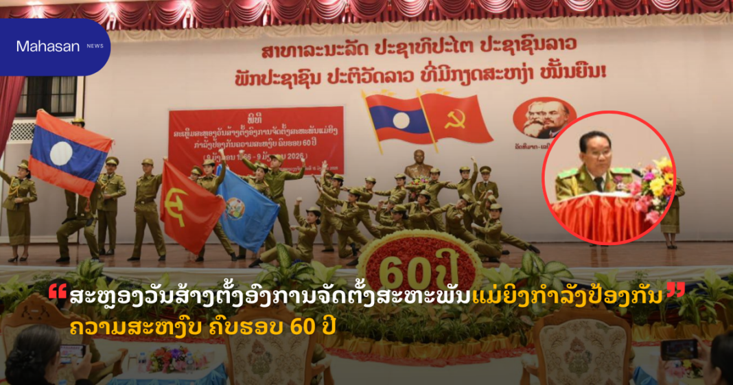 ສະຫະພັນແມ່ຍິງກະຊວງປ້ອງກັນຄວາມສະຫງົບ ໄດ້ຈັດພິທີສະເຫຼີມສະຫຼອງວັນສ້າງຕັ້ງອົງການຈັດຕັ້ງສະຫະ ພັນແມ່ຍິງກຳລັງປ້ອງກັນຄວາມສະຫງົບ ຄົບຮອບ 60 ປີ ( 9 ມັງກອນ 1966-9 ມັງກອນ 2026 ) ໄດ້ຈັດຂຶ້ນໃນວັນ ທີ 15 ມັງກອນ 2026, ເຂົ້າຮ່ວມໂດຍ ພົຈວ ປອ ຫຸມພັນ ຜິວເຂັມພອນ ຄະນພັກະຊວງ ຮອງຫົວໜ້າກົມໃຫຍ່ການເມືອງ ປກສ, ພັອ ນາງ ບຸນທະວີ ພິລາວັນ ຄະນະບໍລິຫານງານສູນກາງສະຫະພັນແມ່ຍິງລາວ ປະທານສະຫະພັນແມ່ຍິງກະຊວງ ປກສ, ພັອ ນາງ ຄຳຢາດ ວິໄລວັນ ຫົວໜ້າຫ້ອງສະຫະພັນແມ່ຍິງ, ມີ ພັນລະຍາການນໍາ, ພະນັກງານອາວຸ ໂສບໍານານ, ຄະນະປະທານ-ຮອງປະທານ ຄະນະບໍລິຫານງານສະຫະພັນແມ່ຍິງກະຊວງ ປກສ, ສະຫະພັນແມ່ຍິງ ປກສ ນະຄອນຫຼວງວຽງຈັນ,ພ້ອມດ້ວຍຄະນະສະຫະພັນແມ່ຍິງຮາກຖານ, ຄະນະໜ່ວຍແມ່ຍິງ ຕະຫຼອດຮອດສະ ມາຊິກແມ່ຍິງ ແລະ ແຂກຖືກເຊີນ ເຂົ້າຮ່ວມ.