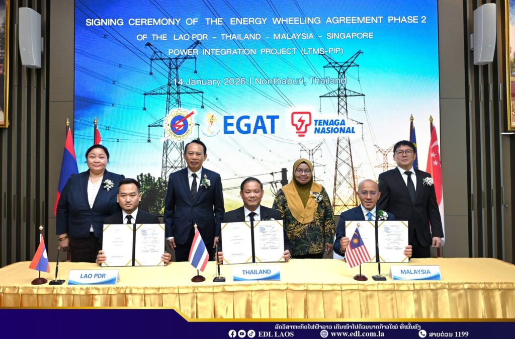 ໃນວັນທີ 14 ມັງກອນ 2026 ຢູ່ທີ່ ນະຄອນຫຼວງບາງກອກ ສຳນັກງານໃຫຍ່ຂອງ ການໄຟຟ້າຝ່າຍຜະລິດແຫ່ງປະເທດໄທ(EGAT) ໄດ້ມີພິທີລົງນາມຮ່ວມມືດ້ານພະລັງງານ ລະຫວ່າງ ລັດວິສາຫະກິດໄຟຟ້າລາວ(EDL), ການໄຟຟ້າຝ່າຍຜະລິດແຫ່ງປະເທດໄທ (EGAT) ແລະ ເທນາການາຊຽນໂນເບີຮັດ (TNB)ປະເທດມາເລເຊຍພາຍໃຕ້ໂຄງການຮ່ວມມື ລາວ-ໄທ-ມາເລເຊຍ-ສິງກະໂປ LTMS-PIP. ຈຸດປະສົງເພື່ອເຊື່ອມລະບົບໄຟຟ້າ 100 ເມກາວັດ (MW) ຈາກ ສປປ ລາວ ໄປຫາ ປະເທດສິງກະໂປ, ໂດຍຜ່ານສາຍສົ່ງທີ່ມີຢູ່ຂອງ ປະເທດໄທ ແລະ ປະເທດມາເລເຊຍ ໄລຍະທີ 2 ມີອາຍຸສັນຍາ 2 ປີ ຈະເປັນການຮ່ວມມືດ້ານພະລັງງານໄຟຟ້າຂອງບັນດາປະເທດອາຊຽນ ບົນພື້ນຖານວິໄສທັດການເຊື່ອມໂຍງຕາຂ່າຍໄຟຟ້າອາຊຽນ (ASEAN Power Grid ຫຼື APG) ໂດຍການລົງນາມຂອງ ທ່ານ ສຸກສະຫວາດ ໂສສຸພັນ ຮອງຜູ້ນຳອໍານວຍການໃຫຍ່ ລັດວິສາຫະກິດໄຟຟ້າລາວ, ທ່ານ ດຣ. ນະຣິນ ເຜົ່າວະນິດ ຜູ້ວ່າການ ການໄຟຟ້າຝ່າຍຜະລິດແຫ່ງປະເທດໄທ ແລະ ທ່ານ Hasmarizal Hassan ຫົວໜ້າເຈົ້າໜ້າທີ່ລະບົບສາຍສົ່ງ (Chief Grid Officer) ມາເລເຊຍ.
