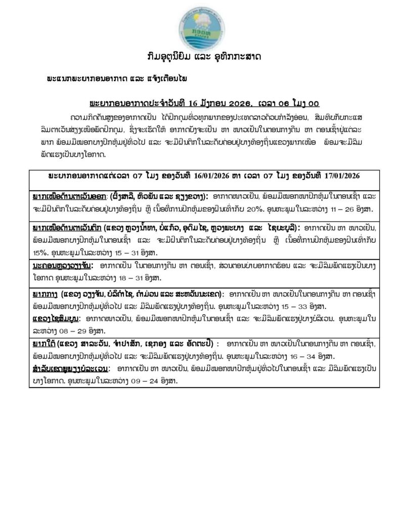 ລາຍງານສະພາບອາກາດປະຈໍາວັນທີ 16 ມັງກອນ ປີ 2026