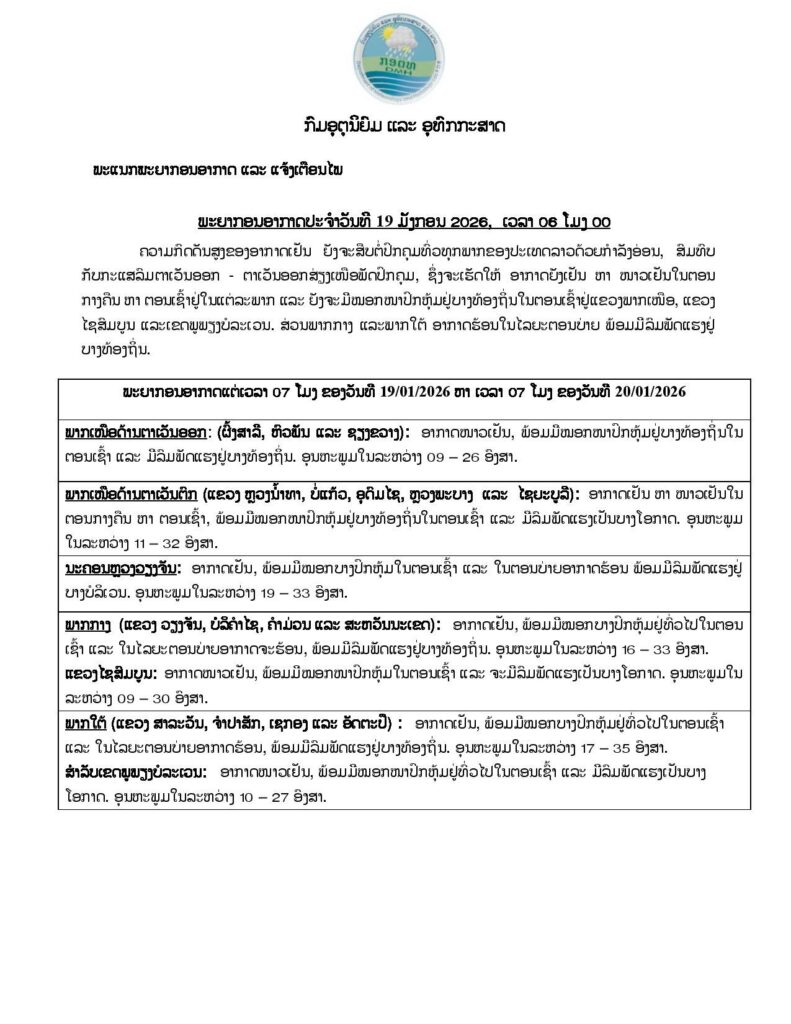 ນະຄອນຫລວງວຽງຈັນ: ອາກາດເຢັນ, ພ້ອມມີໝອກບາງປົກຫຸ້ມໃນຕອນເຊົ້າ ແລະ ໃນຕອນບ່າຍອາກາດຮ້ອນ ພ້ອມມີລົມພັດແຮງຢູ່ບາງບໍລິເວນ ອຸນຫະພູມໃນລະຫວ່າງ 19–33 ອົງສາ.