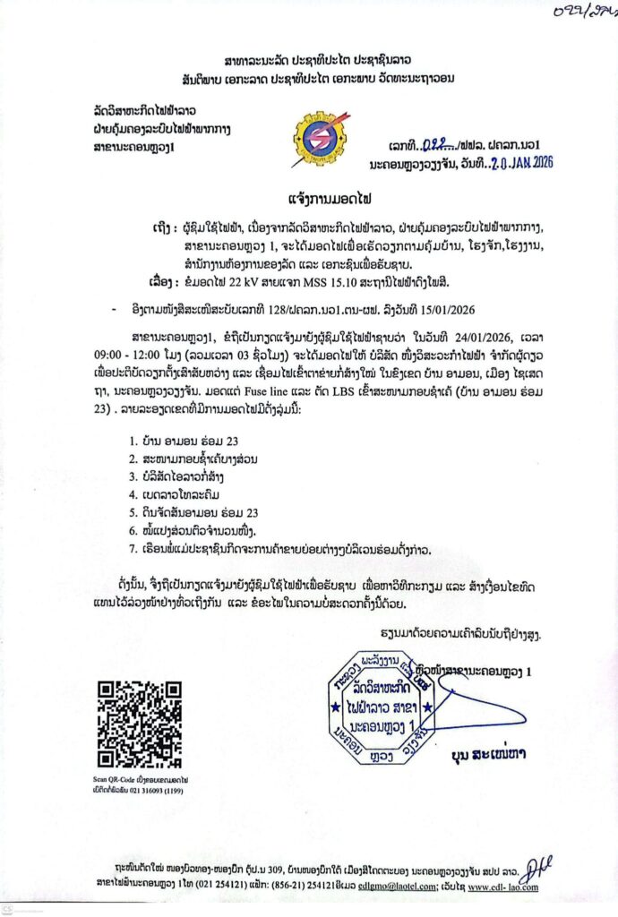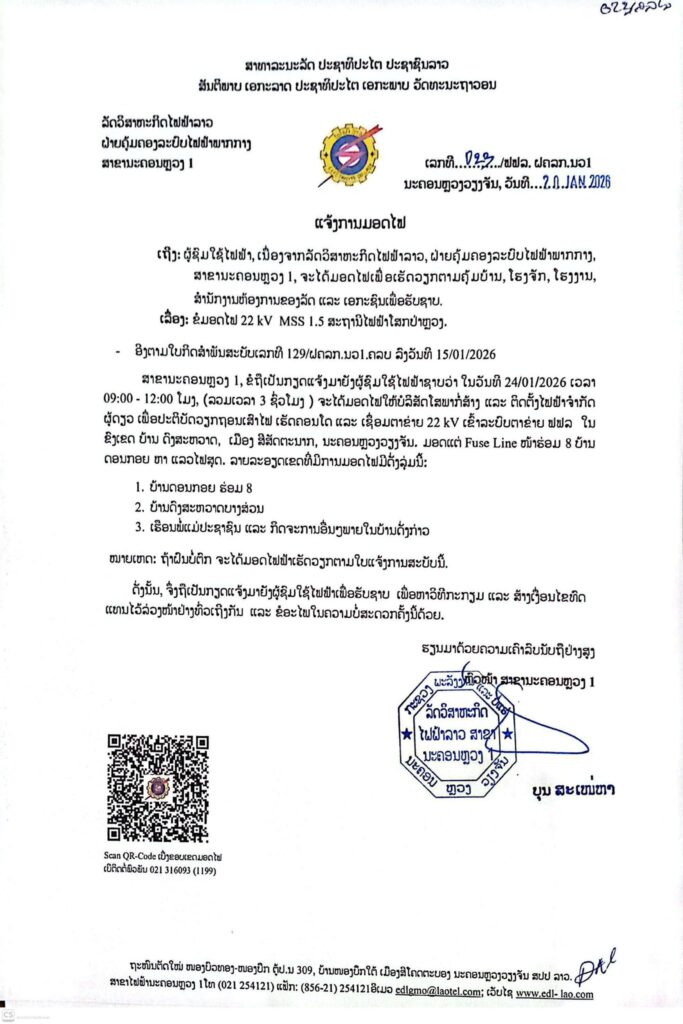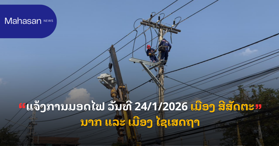 ແຈ້ງການ ແຈ້ງການມອດໄຟ ວັນທີ 24/1/2026 ເມືອງ ສີສັດຕະນາກ ແລະ ເມືອງ ໄຊເສດຖາ By Pele ທີ 20 January, 2026 0 76 Share FacebookTwitterPinterestWhatsApp Must read ກຸ່ມບໍລິສັດໂຊກໄຊ ມອບເງິນ 9,999,999,999 ກີບ ໃຫ້ອົງການປົກຄອງແຂວງສາລະວັນ ນໍາໃຊ້ເຂົ້າໃນການສືບຕໍ່ສ້າງຂົວຂ້າມນ້ຳເຊໂດນ ທີ 22 January, 2026 ມອບ-ຮັບໜ້າທີ່ ເລຂາຄະນະບໍລິຫານງານພັກ ແຂວງຄໍາມ່ວນ ຜູ້ເກົ່າ ແລະ ຜູ້ໃໝ່ ທີ 22 January, 2026 ອັດຕະປື ມອບ-ຮັບ ເລຂາພັກແຂວງ ລະຫວ່າງ ຜູ້ເກົ່າ ແລະ ຜູ້ໃໝ່ ທີ 22 January, 2026 ທັບນັກກິລາຄົນພິການລາວ ຫວັງ 1 ຫຼຽນຄຳ, 3 ຫຼຽນເງິນ ແລະ 5 ຫຼຽນທອງ ຈາກກິລາອາຊຽນພາຣາເກມ ຄັ້ງທີ 13 ທີ 22 January, 2026 Pele ທີ່ມາ: EDL LAOS ລັດວິສາຫະກິດໄຟຟ້າລາວ ສາຂານະຄອນຫຼວງ1 Share FacebookTwitterPinterestWhatsApp Previous articleລາຍງານສະພາບອາກາດປະຈໍາວັນທີ 20 ມັງກອນ ປີ 2026Next articleແຈ້ງການມອດໄຟ ວັນທີ 23,24/01/2026 More articles ແຈ້ງການມອດໄຟວັນທີ 23,24,25/01/2026 ທີ 22 January, 2026 ແຈ້ງປັບລາຄານ້ຳມັນ ເລິ່ມປະຕິບັດ 06:00 ໂມງຂອງວັນທີ 22/01/2026 ທີ 22 January, 2026 ແຈ້ງການມອດໄຟ ວັນທີ 22/1/2026 ເມືອງ ຈັນທະບູລີ ທີ 21 January, 2026 LEAVE A REPLY Cancel reply Comment: Please enter your comment! Name:* Please enter your name here Email:* You have entered an incorrect email address! Please enter your email address here Website: Save my name, email, and website in this browser for the next time I comment. - Advertisement - Latest article ກຸ່ມບໍລິສັດໂຊກໄຊ ມອບເງິນ 9,999,999,999 ກີບ ໃຫ້ອົງການປົກຄອງແຂວງສາລະວັນ ນໍາໃຊ້ເຂົ້າໃນການສືບຕໍ່ສ້າງຂົວຂ້າມນ້ຳເຊໂດນ ທີ 22 January, 2026 ມອບ-ຮັບໜ້າທີ່ ເລຂາຄະນະບໍລິຫານງານພັກ ແຂວງຄໍາມ່ວນ ຜູ້ເກົ່າ ແລະ ຜູ້ໃໝ່ ທີ 22 January, 2026 ອັດຕະປື ມອບ-ຮັບ ເລຂາພັກແຂວງ ລະຫວ່າງ ຜູ້ເກົ່າ ແລະ ຜູ້ໃໝ່ ທີ 22 January, 2026 ທັບນັກກິລາຄົນພິການລາວ ຫວັງ 1 ຫຼຽນຄຳ, 3 ຫຼຽນເງິນ ແລະ 5 ຫຼຽນທອງ ຈາກກິລາອາຊຽນພາຣາເກມ ຄັ້ງທີ 13 ທີ 22 January, 2026 ງານວາງສະແດງ AI ຈັດຂຶ້ນທີ່ແຂວງກວາງຊີ ປະເທດຈີນ ທີ 22 January, 2026