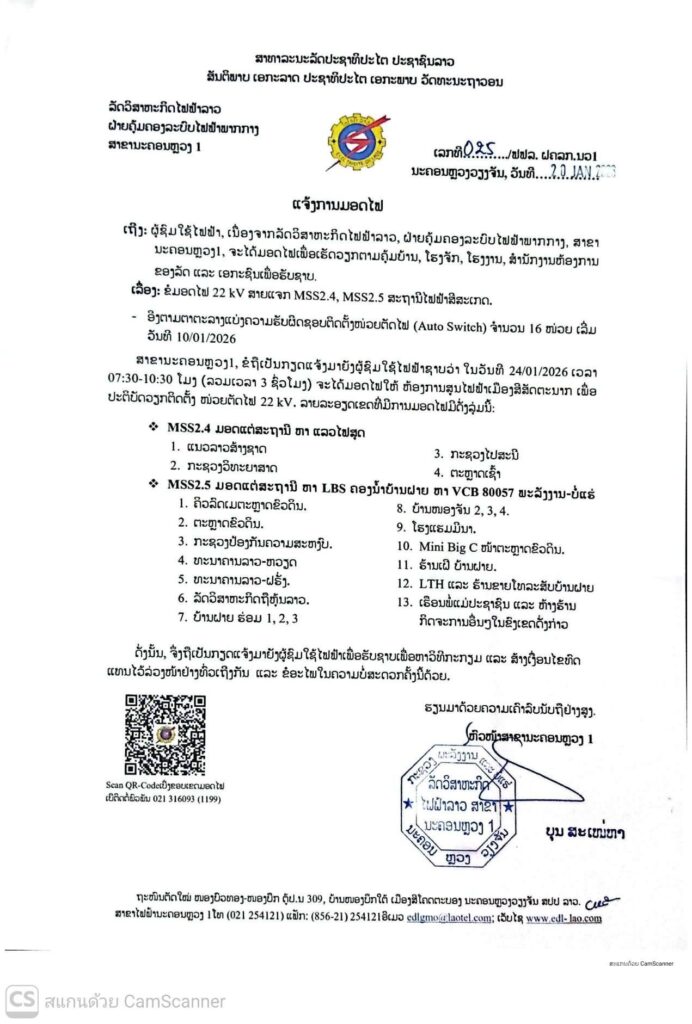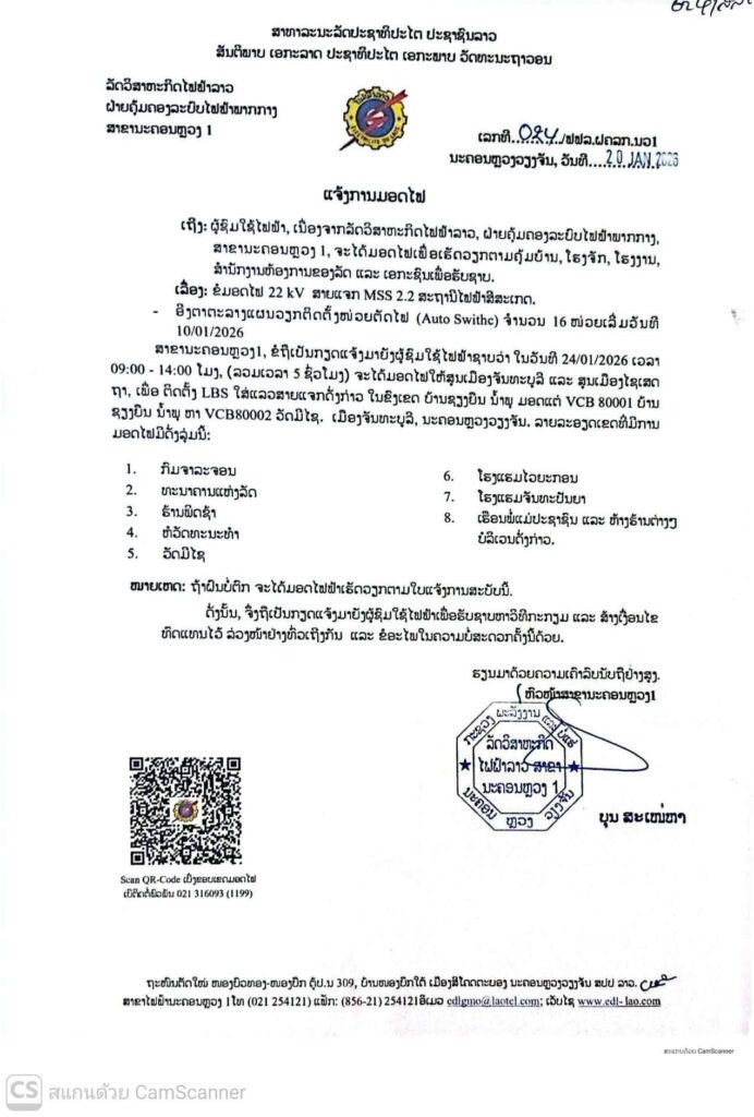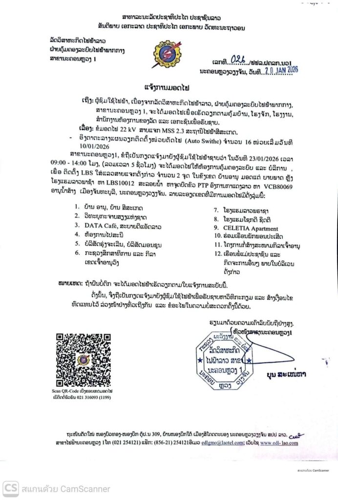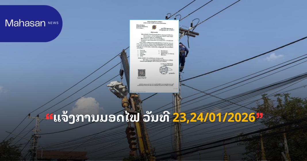 ແຈ້ງການ ແຈ້ງການມອດໄຟ ວັນທີ 23,24/01/2026 By Pele ທີ 20 January, 2026 0 708 Share FacebookTwitterPinterestWhatsApp Must read ກຸ່ມບໍລິສັດໂຊກໄຊ ມອບເງິນ 9,999,999,999 ກີບ ໃຫ້ອົງການປົກຄອງແຂວງສາລະວັນ ນໍາໃຊ້ເຂົ້າໃນການສືບຕໍ່ສ້າງຂົວຂ້າມນ້ຳເຊໂດນ ທີ 22 January, 2026 ມອບ-ຮັບໜ້າທີ່ ເລຂາຄະນະບໍລິຫານງານພັກ ແຂວງຄໍາມ່ວນ ຜູ້ເກົ່າ ແລະ ຜູ້ໃໝ່ ທີ 22 January, 2026 ອັດຕະປື ມອບ-ຮັບ ເລຂາພັກແຂວງ ລະຫວ່າງ ຜູ້ເກົ່າ ແລະ ຜູ້ໃໝ່ ທີ 22 January, 2026 ທັບນັກກິລາຄົນພິການລາວ ຫວັງ 1 ຫຼຽນຄຳ, 3 ຫຼຽນເງິນ ແລະ 5 ຫຼຽນທອງ ຈາກກິລາອາຊຽນພາຣາເກມ ຄັ້ງທີ 13 ທີ 22 January, 2026 Pele ທີ່ມາ: EDL LAOS ລັດວິສາຫະກິດໄຟຟ້າລາວ ສາຂານະຄອນຫຼວງ1 Share FacebookTwitterPinterestWhatsApp Previous articleແຈ້ງການມອດໄຟ ວັນທີ 24/1/2026 ເມືອງ ສີສັດຕະນາກ ແລະ ເມືອງ ໄຊເສດຖາNext articleລາຍງານສະພາບອາກາດປະຈໍາວັນທີ 21 ມັງກອນ ປີ 2026 More articles ແຈ້ງການມອດໄຟວັນທີ 23,24,25/01/2026 ທີ 22 January, 2026 ແຈ້ງປັບລາຄານ້ຳມັນ ເລິ່ມປະຕິບັດ 06:00 ໂມງຂອງວັນທີ 22/01/2026 ທີ 22 January, 2026 ແຈ້ງການມອດໄຟ ວັນທີ 22/1/2026 ເມືອງ ຈັນທະບູລີ ທີ 21 January, 2026 LEAVE A REPLY Cancel reply Comment: Please enter your comment! Name:* Please enter your name here Email:* You have entered an incorrect email address! Please enter your email address here Website: Save my name, email, and website in this browser for the next time I comment. - Advertisement - Latest article ກຸ່ມບໍລິສັດໂຊກໄຊ ມອບເງິນ 9,999,999,999 ກີບ ໃຫ້ອົງການປົກຄອງແຂວງສາລະວັນ ນໍາໃຊ້ເຂົ້າໃນການສືບຕໍ່ສ້າງຂົວຂ້າມນ້ຳເຊໂດນ ທີ 22 January, 2026 ມອບ-ຮັບໜ້າທີ່ ເລຂາຄະນະບໍລິຫານງານພັກ ແຂວງຄໍາມ່ວນ ຜູ້ເກົ່າ ແລະ ຜູ້ໃໝ່ ທີ 22 January, 2026 ອັດຕະປື ມອບ-ຮັບ ເລຂາພັກແຂວງ ລະຫວ່າງ ຜູ້ເກົ່າ ແລະ ຜູ້ໃໝ່ ທີ 22 January, 2026 ທັບນັກກິລາຄົນພິການລາວ ຫວັງ 1 ຫຼຽນຄຳ, 3 ຫຼຽນເງິນ ແລະ 5 ຫຼຽນທອງ ຈາກກິລາອາຊຽນພາຣາເກມ ຄັ້ງທີ 13 ທີ 22 January, 2026 ງານວາງສະແດງ AI ຈັດຂຶ້ນທີ່ແຂວງກວາງຊີ ປະເທດຈີນ ທີ 22 January, 2026