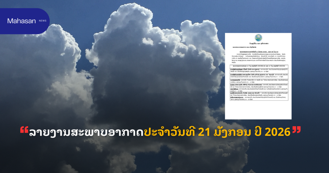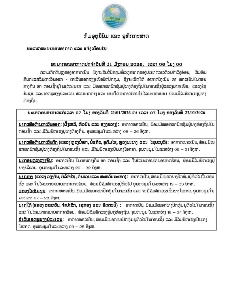 ຄວາມກົດດັນສູງຂອງອາກາດເຢັນ ຍັງຈະສືບຕໍ່ປົກຄຸມທົາວທຸກພາກຂອງປະເທດລາວ ດ້ວຍກໍາລັງອ່ອນ, ສົມທົບກັບກະແສລົມຕາເວັນອອກ-ຕາເວັນອອກສ່ຽງເໜືອພັດປົກຄຸມ,ເຊິ່ງຈະເຮັດໃຫ້ ອາກາດຍັງເຢັນ ຫາ ໜາວເຢັນໃນຕອນກາງຄືນ ຫາ ຕອນເຊົ້າຢູ່ໃນແຕ່ລະພາກ ແລະ ມີໝອກໜາປົກຫຸ້ມຢູ່ບາງທ້ອງຖິ່ນໃນຕອນເຊົ້າຢູ່ແຂວງພາກເໜືອ, ແຂວງໄຊສົມບູນ ແລະ ເຂດພູພຽງບໍລະເວນ. ສ່ວນພາກກາງ ແລະ ພາກໃຕ້ ອາກາດຮ້ອນໃນໄລຍະຕອນບ່າຍ ພ້ອມມີລົມພັດແຮງຢູ່ບາງທ້ອງຖິ່ນ.