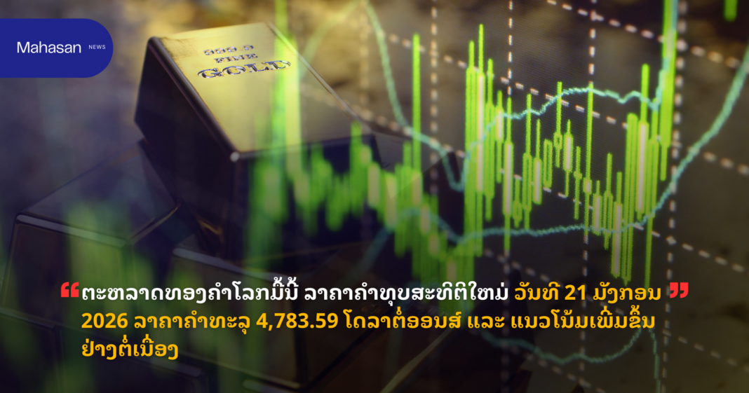 ຕະຫລາດທອງຄຳໂລກມື້ນີ້ ລາຄາຄຳທຸບສະທິຕິໃຫມ່ ວັນທີ 21 ມັງກອນ 2026 ລາຄາຄຳທະລຸ 4,783.59 ໂດລາຕໍ່ອອນສ์ ແລະ ແນວໂນ້ມເພີ່ມຂຶ້ນຢ່າງຕໍ່ເນື່ອງ