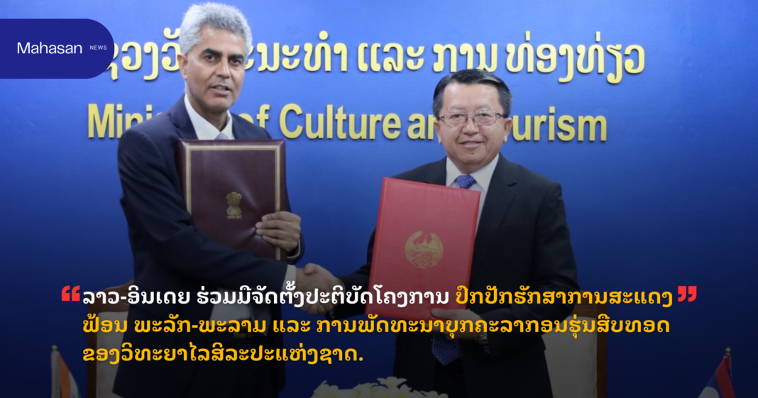 ພິທີລົງນາມເອກະສານວ່າດ້ວຍການຈັດຕັ້ງປະຕິບັດໂຄງການ ດັ່ງກ່າວ ໄດ້ຈັດຂື້ນໃນວັນທີ 19 ມັງກອນ 2026 ທີ່ຜ່ານມານີ້ ທີ່ກະຊວງວັດທະນະທຳ ແລະ ການທ່ອງທ່ຽວ ລະຫວາ່ງ ທ່ານ ວັນສີ ກົວມົວ ຮອງລັດຖະມົນຕີ ກະຊວງ ວັດທະນະທຳ ແລະ ການທ່ອງທ່ຽວ ແຫ່ງ ສປປ ລາວ ແລະ ທ່ານ ໂຢເກສຊວາ ສັງວານ ເອກອັກຄະລັດຖະທູດວິສາມັນຜູ້ມີອຳນາດເຕັມ ແຫ່ງສາທາລະນະລັດ ອິນເດຍ ປະຈຳ ສປປ ລາວ.