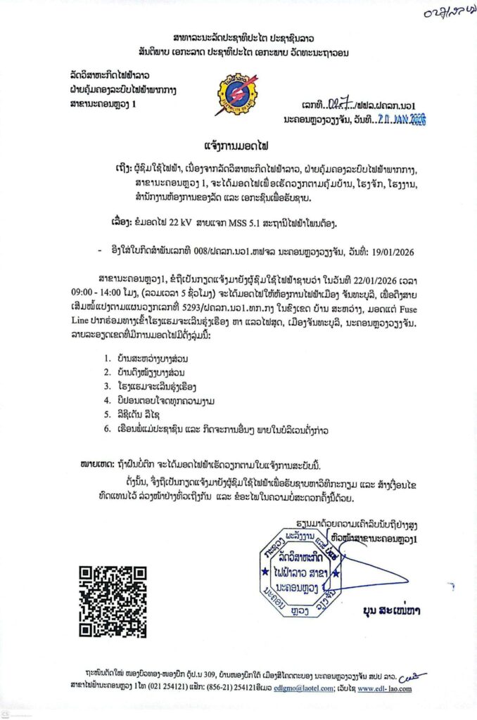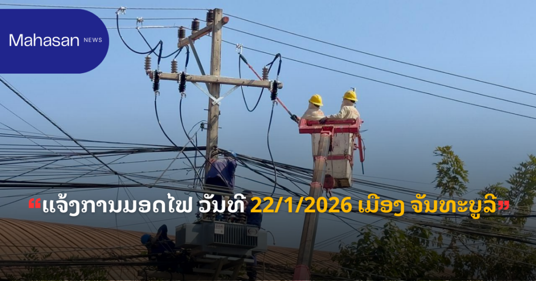ແຈ້ງການ ແຈ້ງການມອດໄຟ ວັນທີ 22/1/2026 ເມືອງ ຈັນທະບູລີ By Pele ທີ 21 January, 2026 0 78 Share FacebookTwitterPinterestWhatsApp Must read ກຸ່ມບໍລິສັດໂຊກໄຊ ມອບເງິນ 9,999,999,999 ກີບ ໃຫ້ອົງການປົກຄອງແຂວງສາລະວັນ ນໍາໃຊ້ເຂົ້າໃນການສືບຕໍ່ສ້າງຂົວຂ້າມນ້ຳເຊໂດນ ທີ 22 January, 2026 ມອບ-ຮັບໜ້າທີ່ ເລຂາຄະນະບໍລິຫານງານພັກ ແຂວງຄໍາມ່ວນ ຜູ້ເກົ່າ ແລະ ຜູ້ໃໝ່ ທີ 22 January, 2026 ອັດຕະປື ມອບ-ຮັບ ເລຂາພັກແຂວງ ລະຫວ່າງ ຜູ້ເກົ່າ ແລະ ຜູ້ໃໝ່ ທີ 22 January, 2026 ທັບນັກກິລາຄົນພິການລາວ ຫວັງ 1 ຫຼຽນຄຳ, 3 ຫຼຽນເງິນ ແລະ 5 ຫຼຽນທອງ ຈາກກິລາອາຊຽນພາຣາເກມ ຄັ້ງທີ 13 ທີ 22 January, 2026 Pele ທີ່ມາ: EDL LAOS ລັດວິສາຫະກິດໄຟຟ້າລາວ ສາຂານະຄອນຫຼວງ1 Share FacebookTwitterPinterestWhatsApp Previous articleທຳລາຍສິນຄ້າ ອາຫານ, ຢາ ແລະ ຜະລິດຕະພັນການແພດທີ່ຕ້ອງຫ້າມ ລວມມູນຄ່າ 1 ຕື້ກວ່າກີບNext articleລາຍງານສະພາບອາກາດປະຈໍາວັນທີ 22 ມັງກອນ ປີ 2026 More articles ແຈ້ງການມອດໄຟວັນທີ 23,24,25/01/2026 ທີ 22 January, 2026 ແຈ້ງປັບລາຄານ້ຳມັນ ເລິ່ມປະຕິບັດ 06:00 ໂມງຂອງວັນທີ 22/01/2026 ທີ 22 January, 2026 ແຈ້ງການມອດໄຟ ວັນທີ 23,24/01/2026 ທີ 20 January, 2026 LEAVE A REPLY Cancel reply Comment: Please enter your comment! Name:* Please enter your name here Email:* You have entered an incorrect email address! Please enter your email address here Website: Save my name, email, and website in this browser for the next time I comment. - Advertisement - Latest article ກຸ່ມບໍລິສັດໂຊກໄຊ ມອບເງິນ 9,999,999,999 ກີບ ໃຫ້ອົງການປົກຄອງແຂວງສາລະວັນ ນໍາໃຊ້ເຂົ້າໃນການສືບຕໍ່ສ້າງຂົວຂ້າມນ້ຳເຊໂດນ ທີ 22 January, 2026 ມອບ-ຮັບໜ້າທີ່ ເລຂາຄະນະບໍລິຫານງານພັກ ແຂວງຄໍາມ່ວນ ຜູ້ເກົ່າ ແລະ ຜູ້ໃໝ່ ທີ 22 January, 2026 ອັດຕະປື ມອບ-ຮັບ ເລຂາພັກແຂວງ ລະຫວ່າງ ຜູ້ເກົ່າ ແລະ ຜູ້ໃໝ່ ທີ 22 January, 2026 ທັບນັກກິລາຄົນພິການລາວ ຫວັງ 1 ຫຼຽນຄຳ, 3 ຫຼຽນເງິນ ແລະ 5 ຫຼຽນທອງ ຈາກກິລາອາຊຽນພາຣາເກມ ຄັ້ງທີ 13 ທີ 22 January, 2026 ງານວາງສະແດງ AI ຈັດຂຶ້ນທີ່ແຂວງກວາງຊີ ປະເທດຈີນ ທີ 22 January, 2026