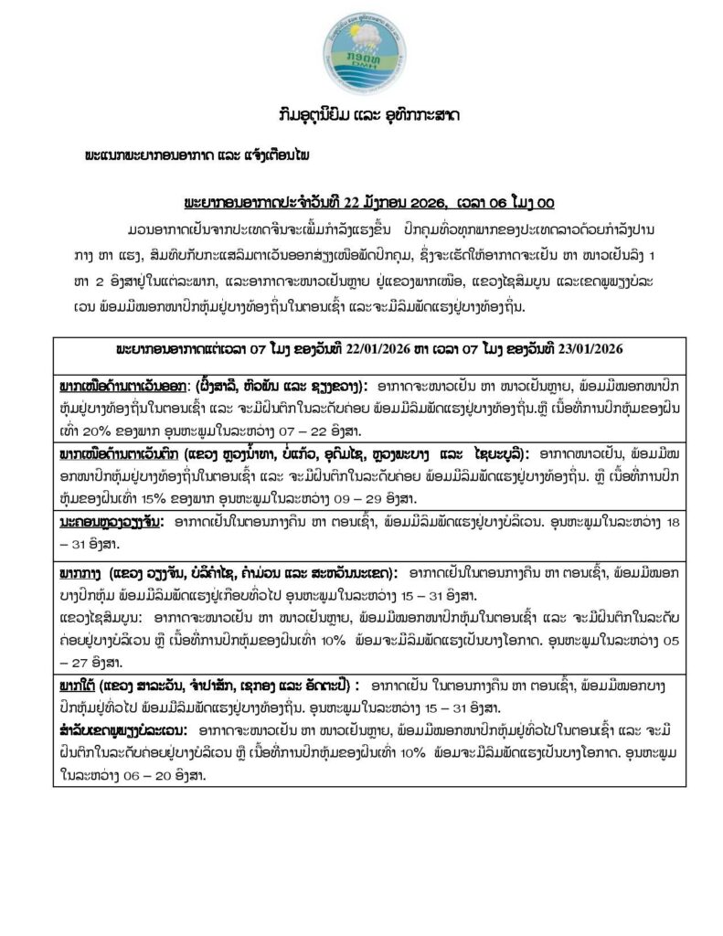 ມວນອາກາດເຢັນຈາກປະເທດຈີນ ຈະເພີ່ມກໍາລັງແຮງຂຶ້ນ ປົກຄຸມທົ່ວທຸກພາກຂອງປະເທດລາວ ດ້ວຍກໍາລັງປານກາງ ຫາ ແຮງ, ສົມທົບກັບກະແສລົມຕາເວັນອອກສ່ຽງເໜືອພັດປົກຄຸມ, ເຊິ່ງຈະເຮັດໃຫ້ອາກາດຈະເຢັນ ຫາ ໜາວເຢັນ ລົງ 1ຫາ 2 ອົງສາຢູ່ໃນແຕ່ລະພາກ ແລະ ອາກາດຈະໜາວເຢັນຫລາຍຢູ່ແຂວງພາກເໜືອ, ແຂວງໄຊສົມບູນ ແລະ ເຂດພູພຽງບໍລະເວນ ພ້ອມມີໝອກໜາປົກຫຸ້ມຢູ່ບາງທ້ອງຖິ່ນໃນຕອນເຊົ້າ ແລະ ຈະມີລົມພັດແຮງຢູ່ບາງທ້ອງຖິ່ນ.
