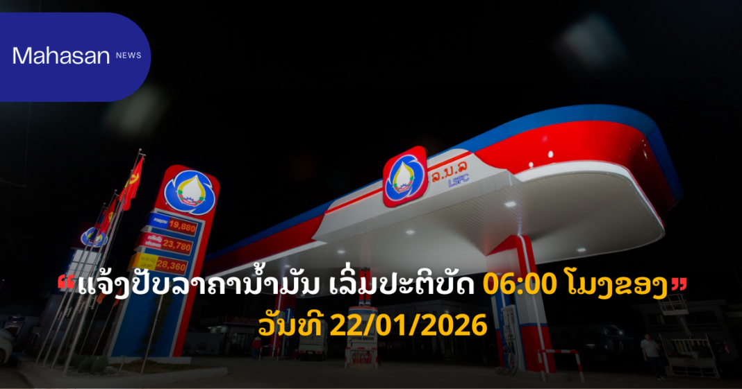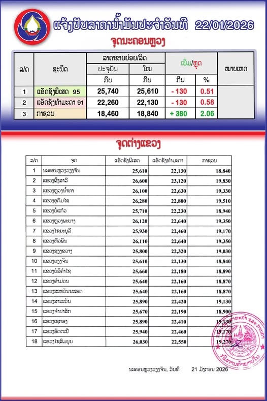 ແຈ້ງການ ແຈ້ງປັບລາຄານ້ຳມັນ ເລິ່ມປະຕິບັດ 06:00 ໂມງຂອງວັນທີ 22/01/2026 By Pele ທີ 22 January, 2026 0 242 Share FacebookTwitterPinterestWhatsApp Must read ກຸ່ມບໍລິສັດໂຊກໄຊ ມອບເງິນ 9,999,999,999 ກີບ ໃຫ້ອົງການປົກຄອງແຂວງສາລະວັນ ນໍາໃຊ້ເຂົ້າໃນການສືບຕໍ່ສ້າງຂົວຂ້າມນ້ຳເຊໂດນ ທີ 22 January, 2026 ມອບ-ຮັບໜ້າທີ່ ເລຂາຄະນະບໍລິຫານງານພັກ ແຂວງຄໍາມ່ວນ ຜູ້ເກົ່າ ແລະ ຜູ້ໃໝ່ ທີ 22 January, 2026 ອັດຕະປື ມອບ-ຮັບ ເລຂາພັກແຂວງ ລະຫວ່າງ ຜູ້ເກົ່າ ແລະ ຜູ້ໃໝ່ ທີ 22 January, 2026 ທັບນັກກິລາຄົນພິການລາວ ຫວັງ 1 ຫຼຽນຄຳ, 3 ຫຼຽນເງິນ ແລະ 5 ຫຼຽນທອງ ຈາກກິລາອາຊຽນພາຣາເກມ ຄັ້ງທີ 13 ທີ 22 January, 2026 Pele ແຈ້ງປັບລາຄານ້ຳມັນ ເລິ່ມປະຕິບັດ 06:00 ໂມງຂອງວັນທີ 22/01/2026 ຕາມແຈ້ງການຈາກ ກຊ ອຸດສະຫະກຳແລະການຄ້າ ເລກທີ 0109/ກຄພນ ລົງວັນທີ 21.ມກ. 2026 ທີ່ມາ:LAO STATE FUEL COMPANY (LSFC) ລັດວິສາຫະກິດ ນໍ້າມັນເຊຶ້ອໄຟລາວ (ລນລ) Share FacebookTwitterPinterestWhatsApp Previous articleລາຍງານສະພາບອາກາດປະຈໍາວັນທີ 22 ມັງກອນ ປີ 2026Next articleແຈ້ງການມອດໄຟວັນທີ 23,24,25/01/2026 More articles ແຈ້ງການມອດໄຟວັນທີ 23,24,25/01/2026 ທີ 22 January, 2026 ແຈ້ງການມອດໄຟ ວັນທີ 22/1/2026 ເມືອງ ຈັນທະບູລີ ທີ 21 January, 2026 ແຈ້ງການມອດໄຟ ວັນທີ 23,24/01/2026 ທີ 20 January, 2026 LEAVE A REPLY Cancel reply Comment: Please enter your comment! Name:* Please enter your name here Email:* You have entered an incorrect email address! Please enter your email address here Website: Save my name, email, and website in this browser for the next time I comment. - Advertisement - Latest article ກຸ່ມບໍລິສັດໂຊກໄຊ ມອບເງິນ 9,999,999,999 ກີບ ໃຫ້ອົງການປົກຄອງແຂວງສາລະວັນ ນໍາໃຊ້ເຂົ້າໃນການສືບຕໍ່ສ້າງຂົວຂ້າມນ້ຳເຊໂດນ ທີ 22 January, 2026 ມອບ-ຮັບໜ້າທີ່ ເລຂາຄະນະບໍລິຫານງານພັກ ແຂວງຄໍາມ່ວນ ຜູ້ເກົ່າ ແລະ ຜູ້ໃໝ່ ທີ 22 January, 2026 ອັດຕະປື ມອບ-ຮັບ ເລຂາພັກແຂວງ ລະຫວ່າງ ຜູ້ເກົ່າ ແລະ ຜູ້ໃໝ່ ທີ 22 January, 2026 ທັບນັກກິລາຄົນພິການລາວ ຫວັງ 1 ຫຼຽນຄຳ, 3 ຫຼຽນເງິນ ແລະ 5 ຫຼຽນທອງ ຈາກກິລາອາຊຽນພາຣາເກມ ຄັ້ງທີ 13 ທີ 22 January, 2026 ງານວາງສະແດງ AI ຈັດຂຶ້ນທີ່ແຂວງກວາງຊີ ປະເທດຈີນ ທີ 22 January, 2026