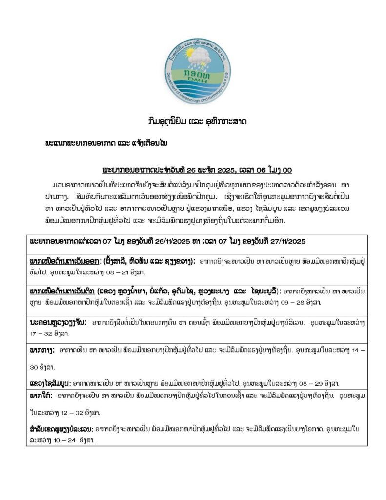 ແຂວງໄຊສົມບູນ: ອາກາດໜາວເຢັນ ຫາ ໜາວເຢັນຫລາຍ ພ້ອມມີໝອກໜາປົກຫຸ້ມຢູ່ທົ່ວໄປ ອຸນຫະພູມໃນລະຫວ່າງ 08–29 ອົງສາ.