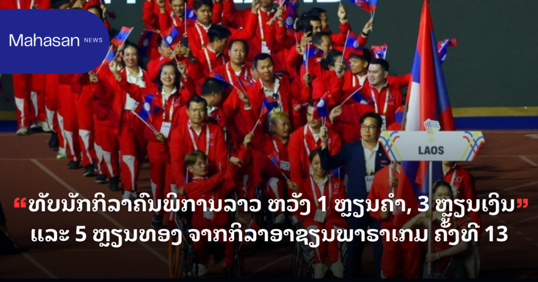 ສປປ ລາວ ສົ່ງຄະນະນັກກິລາເຂົ້າຮ່ວມທັງໝົດ 160 ກວ່າຄົນ ຈາກ 12 ປະເພດກິລາ ພ້ອມຕັ້ງເປົ້າຈະພະຍາຍາມສູ້ຊົນຍາດໃຫ້ໄດ້ຢ່າງໜ້ອຍ 1 ຫຼຽນຄຳ, 3 ຫຼຽນເງິນ ແລະ 5 ຫຼຽນທອງ ຈາກງານມະຫະກຳກິລາຄົນພິການອາຊຽນພາຣາເກມ ຄັ້ງທີ 13 (ASEAN Para Games 2025) ທີ່ປະ ເທດໄທ ທີ່ໄດ້ເປີດຢ່າງເປັນທາງການໃນວັນທີ 20 ມັງກອນ 2026 ທີ່ຜ່ານມາ ຢູ່ສະໜາມກິລາ 80 ພັນສາ ນະຄອນຣາຊະສີມາ.