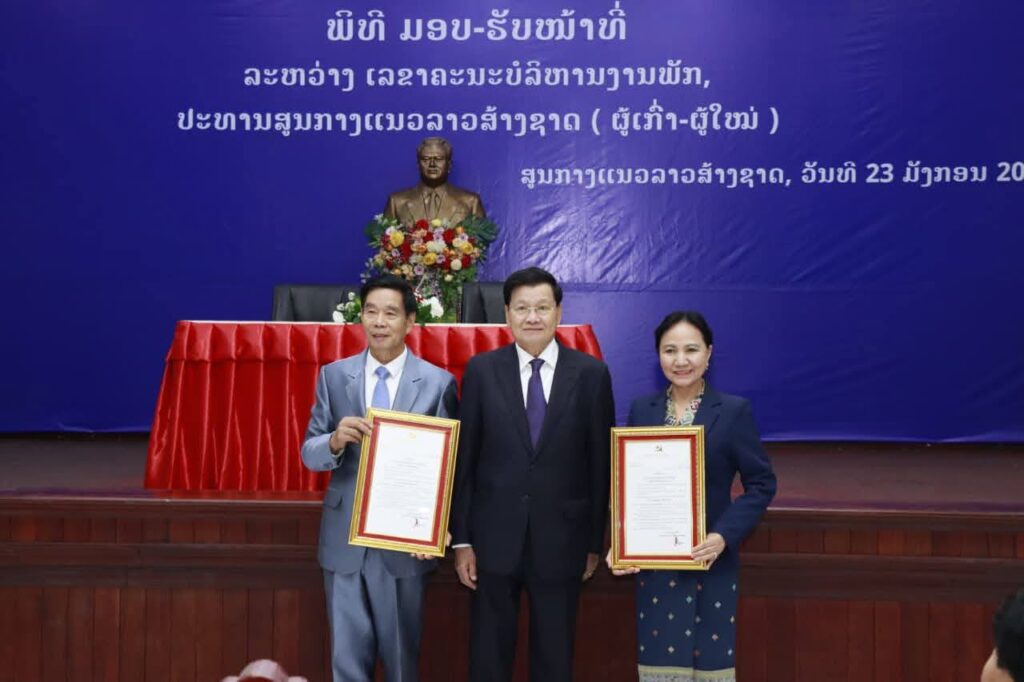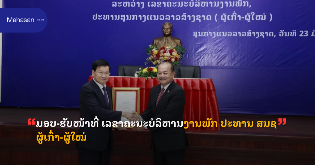 ພິທີມອບ-ຮັບໜ້າທີ່ລະຫວ່າງ ເລຂາຄະນະບໍລິຫານງານພັກ ປະທານສູນກາງແນວລາວສ້າງຊາດ (ສນຊ)ຜູ້ເກົ່າ ແລະ ຜູ້ໃໝ່ ຈັດຂຶ້ນໃນວັນທີ 23 ມັງກອນນີ້, ໂດຍການເຂົ້າຮ່ວມຂອງສະຫາຍ ທອງລຸນ ສີສຸລິດ ເລຂາທິການໃຫຍ່ ຄະນະບໍລິຫານງານສູນກາງພັກ ປະທານປະເທດແຫ່ງ ສປປ ລາວ ພ້ອມດ້ວຍພາກສ່ວນກ່ຽວ ຂ້ອງເຂົ້າ ຮ່ວມ.