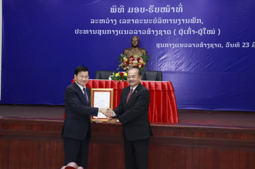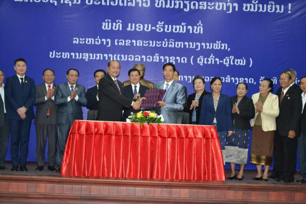 ໃນພິທີໄດ້ເຊັນບົດບັນທຶກມອບ-ຮັບໜ້າທີ່ລະຫວ່າງສະຫາຍ ສິນລະວົງ ຄຸດໄພທູນ ເລຂາຄະນະບໍລິຫານງານພັກ ປະທານ ສນຊ ຜູ້ເກົ່າ ແລະ ສະຫາຍ ກິແກ້ວ ໄຂຄຳພິທູນ ເລຂາຄະນະບໍລິຫານງານພັກ ປະທານ ສນຊ ຜູ້ໃໝ່.