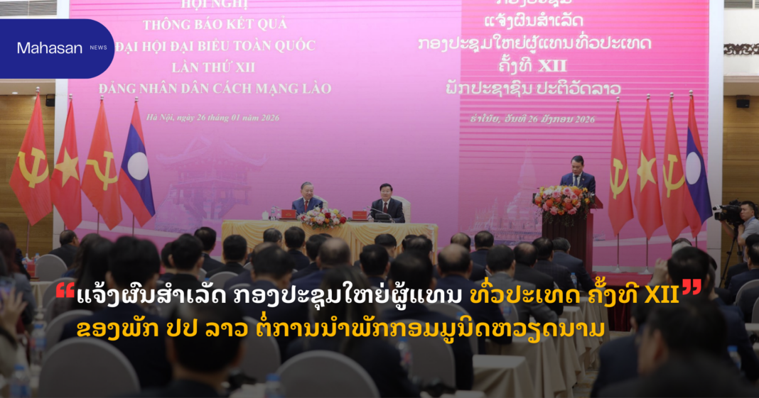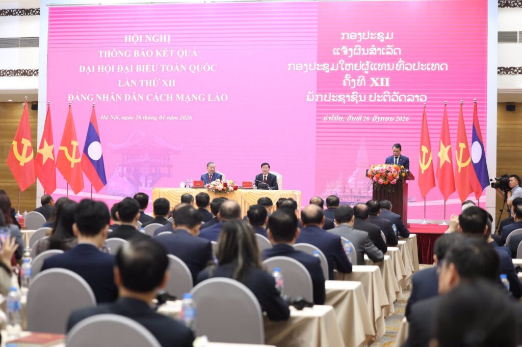 ຂປລ. ກອງປະຊຸມແຈ້ງຜົນສໍາເລັດ ຂອງກອງປະຊຸມໃຫຍ່ຜູ້ແທນທົ່ວປະເທດ ຄັ້ງທີ XII ຂອງພັກປະຊາຊົນປະຕິວັດລາວ ຈັດຂຶ້ນໃນວັນທີ 26 ມັງກອນ 2026 ຢູ່ສູນປະຊຸມສາກົນ, ນະຄອນ ຫລວງຮ່າໂນ້ຍ ໂດຍການເປັນປະທານຂອງ ສະຫາຍ ທອງລຸນ ສີສຸລິດ ເລຂາທິການໃຫຍ່ ຄະນະບໍລິ ຫານງານສູນກາງພັກປະຊາຊົນປະຕິວັດລາວ, ປະທານປະເທດ ແຫ່ງ ສປປ ລາວ ແລະ ສະຫາຍ ໂຕ ເລິມ ເລຂາທິການໃຫຍ່ ຄະນະບໍລິຫານງານສູນກາງພັກກອມມູນິດຫວຽດນາມ ພ້ອມດ້ວຍຄະນະຜູ້ແທນຂັ້ນສູງຂອງທັງສອງຝ່າຍ ເຂົ້າຮ່ວມ.